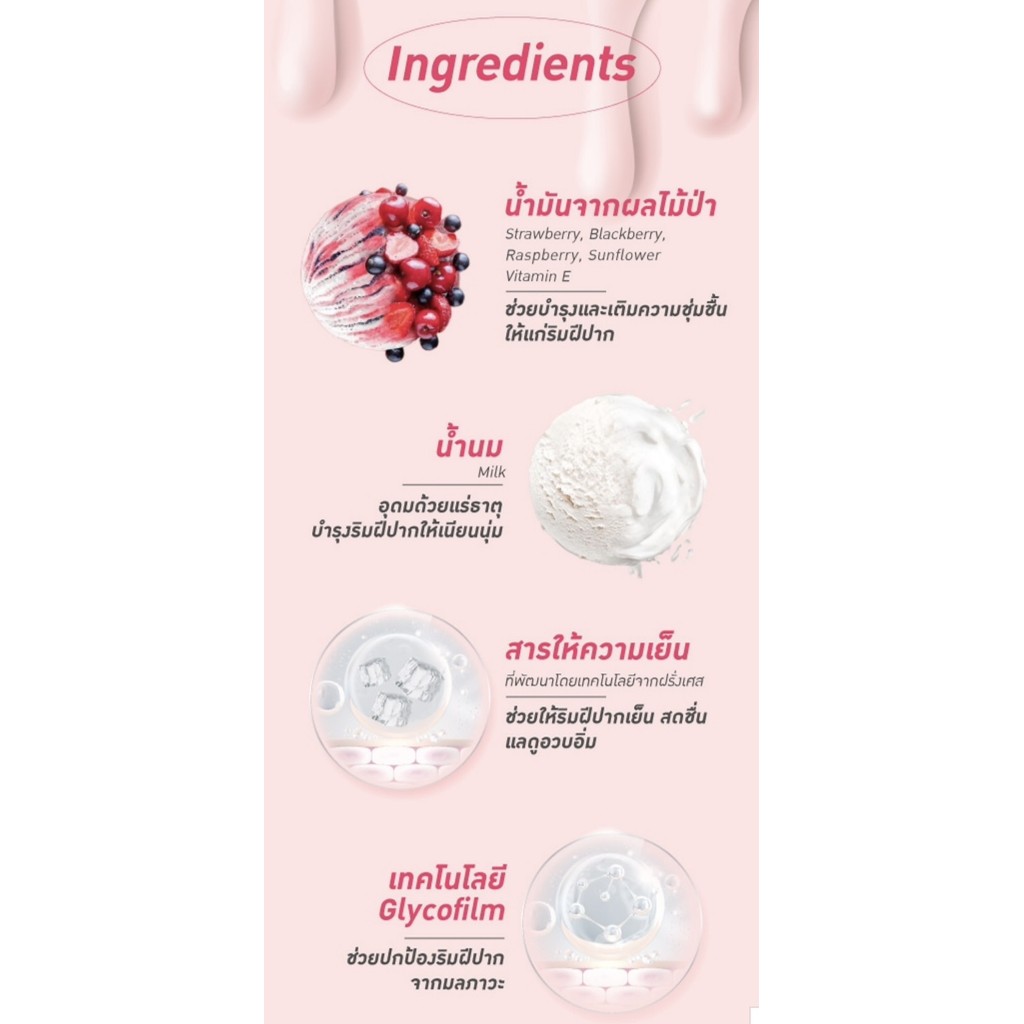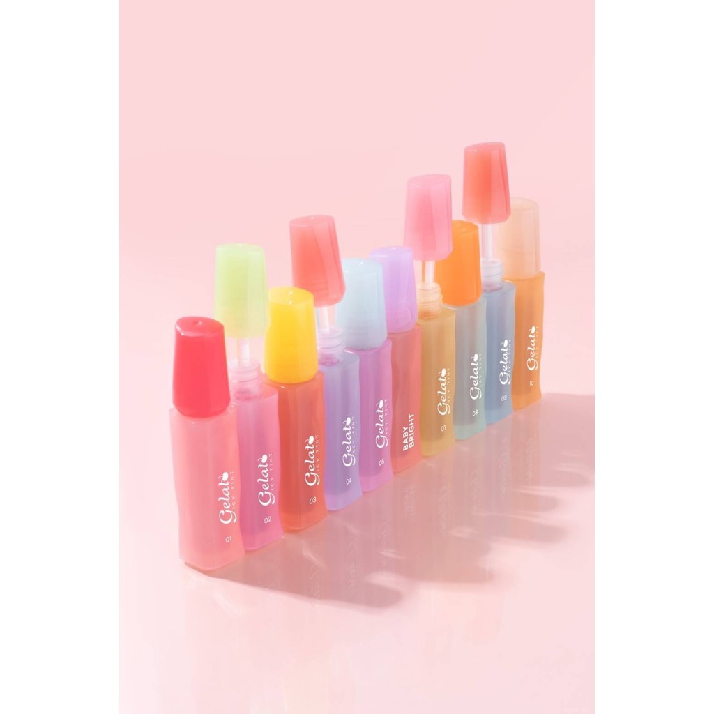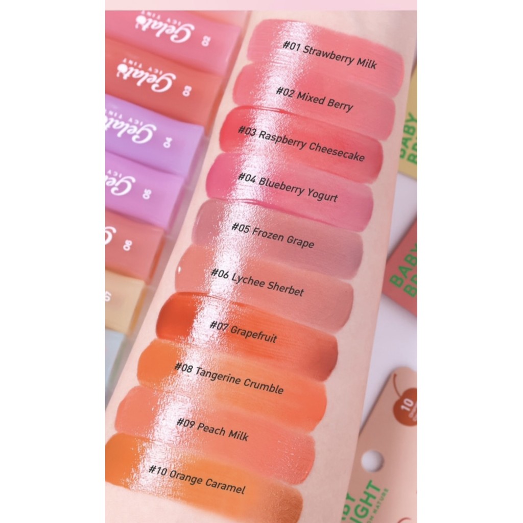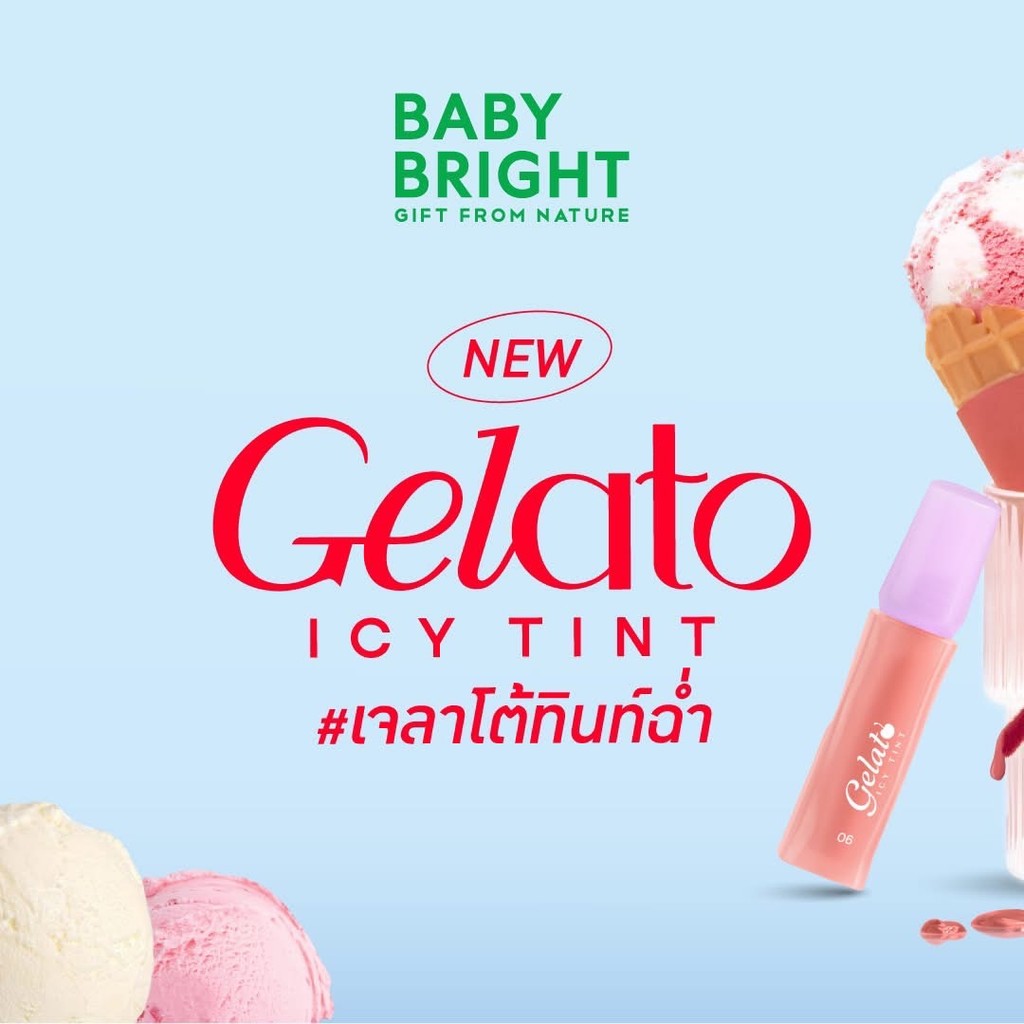 เบบี้ไบร์ท เจลาโต้ไอซี่ทินท์ ทินท์เนื้อน้ำ สีชัด ติดทนนาน เย็นสบายปาก เกลี่ยง่าย ไม่เหนียวเหนอะหนะ อุดมไปด้วยสารสกัดน้ำมันจากผลไม้ป่า (Fruit Of The Forest Oil) ประกอบด้วย สตรอว์เบอร์รี่ (Fragaria Ananassa (Strawberry) Fruit Extract) แบล็กเบอร์รี่ (Rubus Fruticosus (Blackberry) Fruit Extract) ราสเบอร์รี่ (Rubus Idaeus (Raspberry) Fruit Extract) น้ำมันดอกทานตะวัน (Helianthus Annuus (Sunflower) Seed Oil) และวิตามินอี (Tocopherol) ที่มีสารแอนตี้ออกซิแดนท์ ช่วยบำรุงและเติมความชุ่มชื้นให้แก่ริมฝีปาก ผสานเทคโนโลยีจาก Glycofilm ที่ช่วยปกป้องริมฝีปากจากมลภาวะ พร้อมด้วย Encapsulated จากวิตามินซี (Ascorbic Acid) และวิตามินอี (Tocopherol) ที่ช่วยกักเก็บวิตามินให้มีประสิทธิภาพมากยิ่งขึ้น ทั้งยังมีสารสกัดจากน้ำนม (Milk Extract) ที่อุดมไปด้วยแร่ธาตุ ช่วยบำรุงริมฝีปาก ให้ริมฝีปากเนียนนุ่ม รวมทั้งมีสารให้ความเย็นที่พัฒนาโดยเทคโนโลยีจากฝรั่งเศส ที่ช่วยให้ริมฝีปากเย็น สดชื่น แลดูอวบอิ่ม สุขภาพดีอย่างเป็นธรรมชาติได้นานตลอดวัน ปราศจากแอลกอฮอล์และพาราเบน