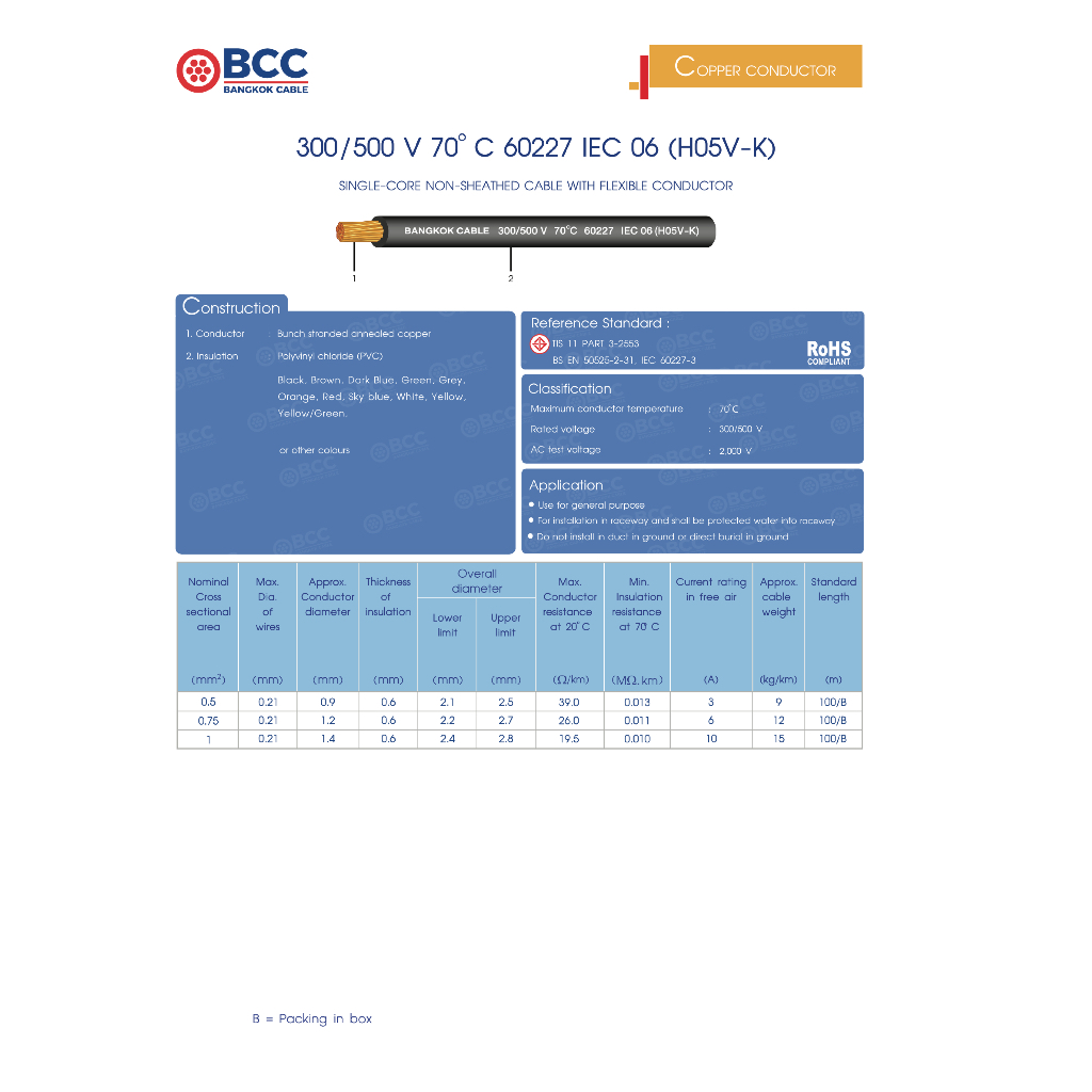 BCC สายคอนโทรล H07V-K-LF 1X2.5 SQMM 750V 70C 100m VSF Bangkok Cable