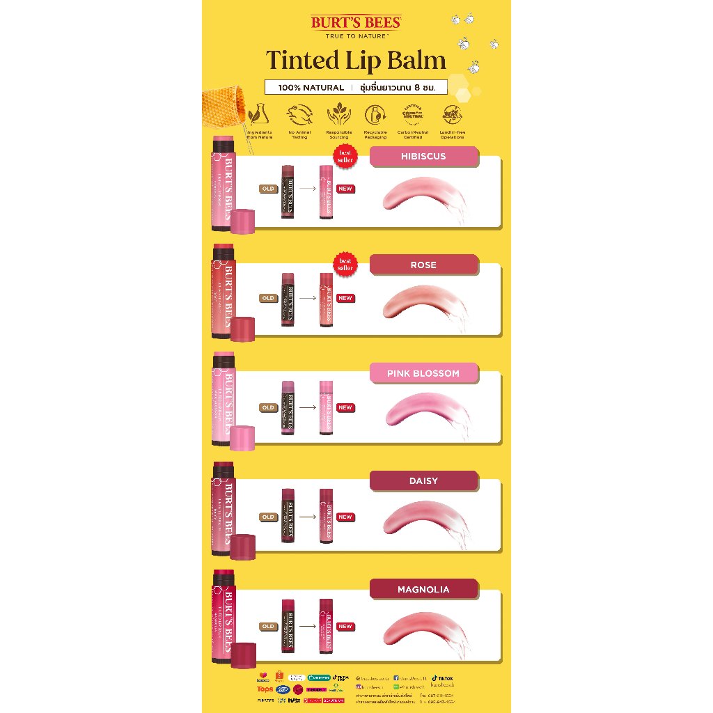 ครั้งแรกของการเติมเสน่ห์ของลิปบาล์มให้สีสันตามธรรมชาติ พร้อมให้การบำรุง ยาวนานเนื้อบางเบาแต่ให้ความชุ่มชื่นล้ำลึกสู่เรียวปาก หอมกลิ่นแพร์ อุดมด้วย ส่วนผสมจากธรรมชาติ 100% พิเศษด้วยบีส์แว็กซ์ที่ผสมผสานฟลาเวอร์แว็กซ์ หรือไขสกัดจากดอกไม้ 2 ชนิดคืออิลัง อิลังหรือกระดังงา และมะลิ รวมทั้งเชียบัทเทอร์อันอุดมด้วยความชุ่มชื่น และวิตามินอี ให้ริมฝีปากคุณรู้สึกอ่อนละมุน ดั่งกลีบดอกไม้แย้มบาน