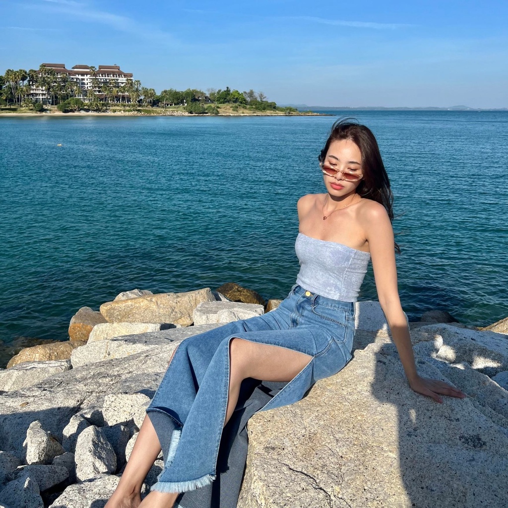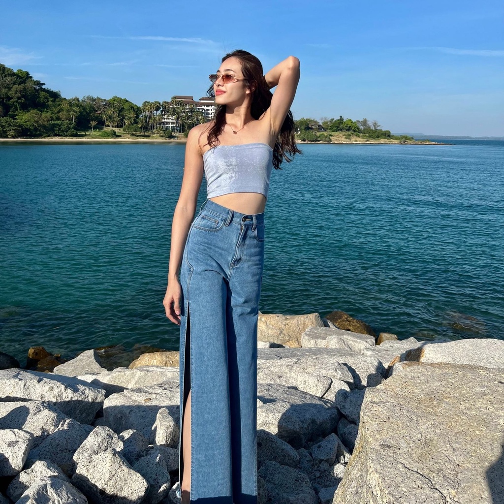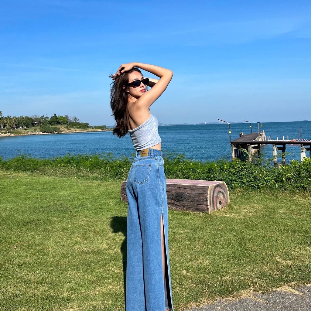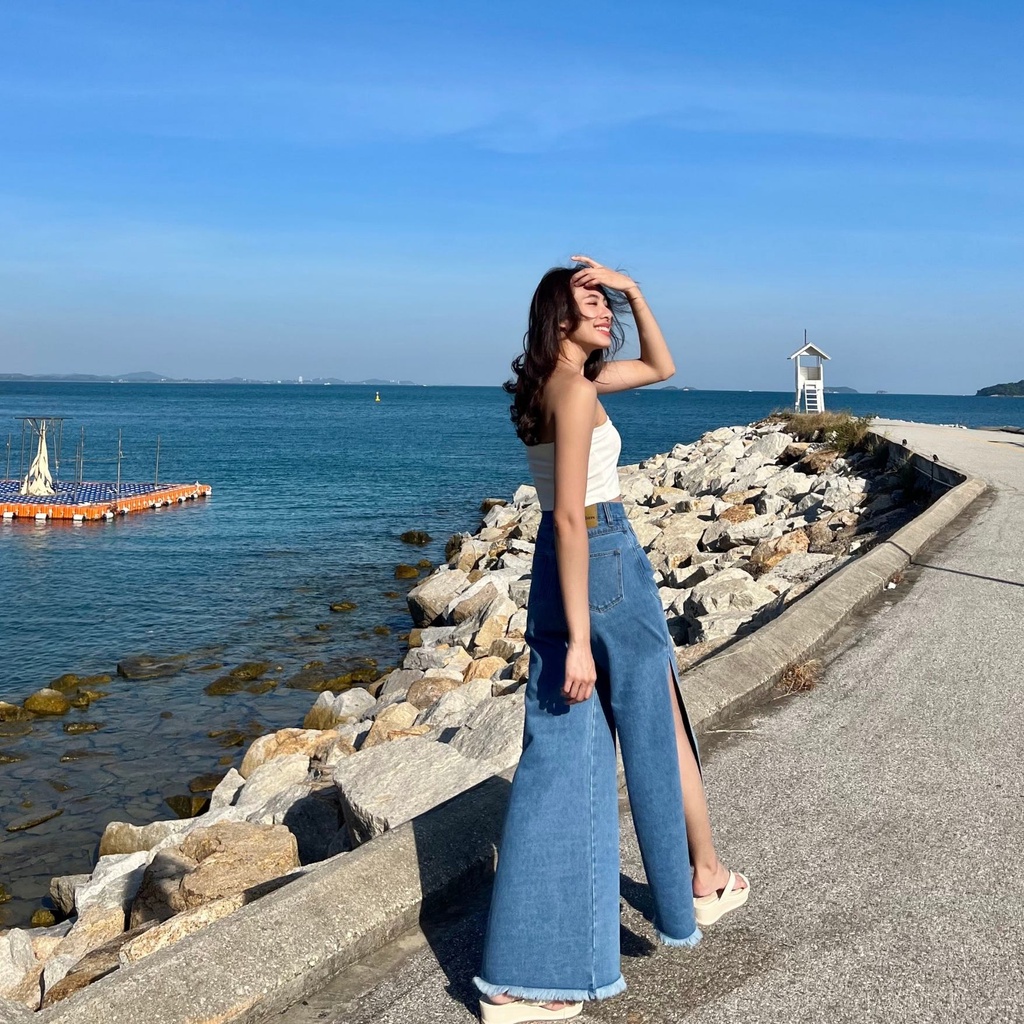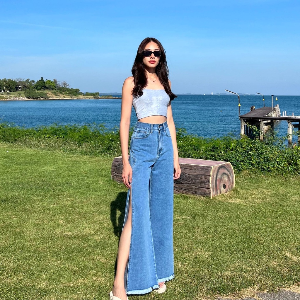 กางเกงยีนส์ขายาว ผ่าข้าง เอวสูง เก็บหน้าท้อง ใส่แล้วดูผอม สูง และขาเรียวขึ้น