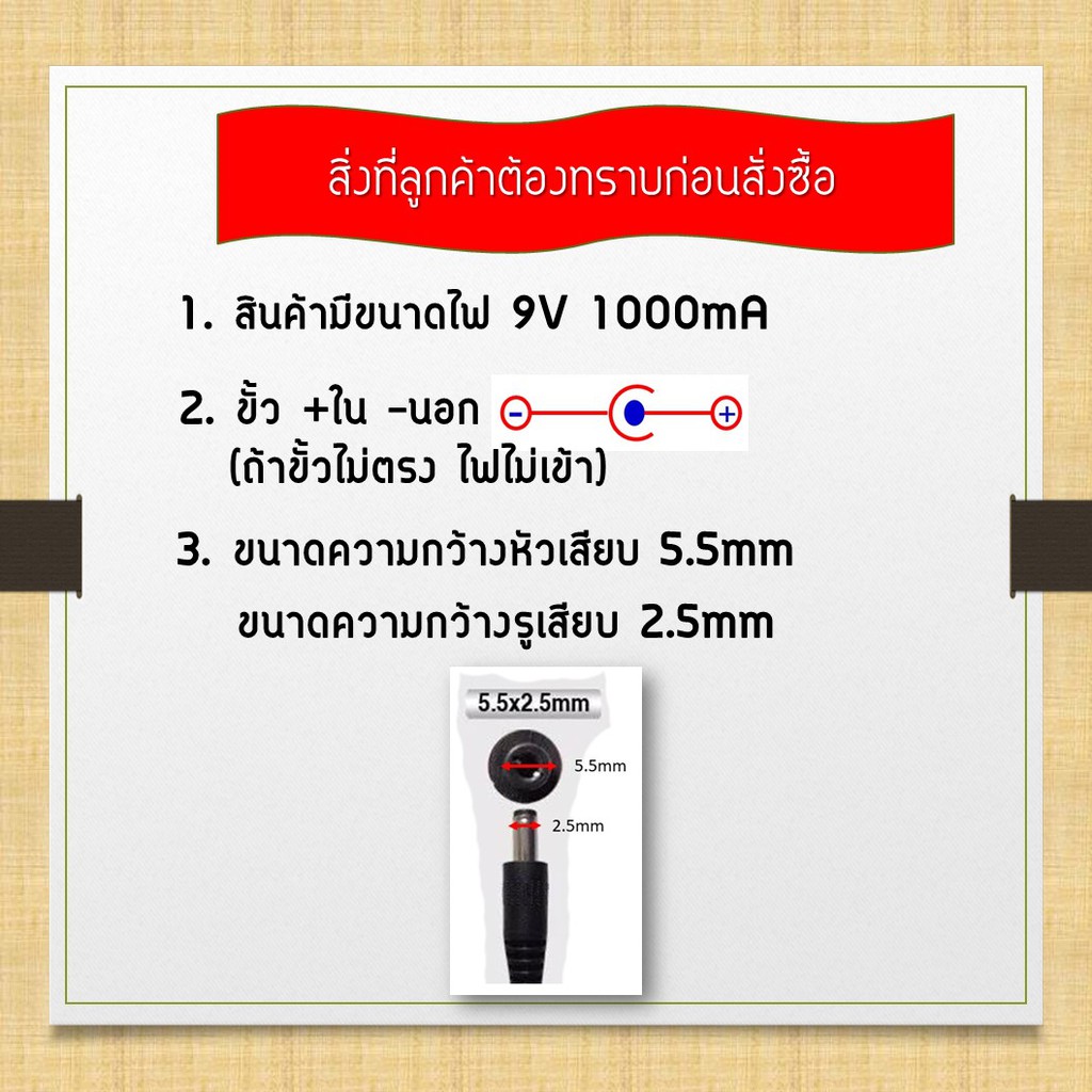 – DC 9V 1000mA ให้ไฟสม่ำเสมอ ทำให้หัวเสียบไม่ร้อนเร็ว เหมาะสำหรับเครื่องใช้ไฟฟ้าที่เสียบเป็นเวลานาน