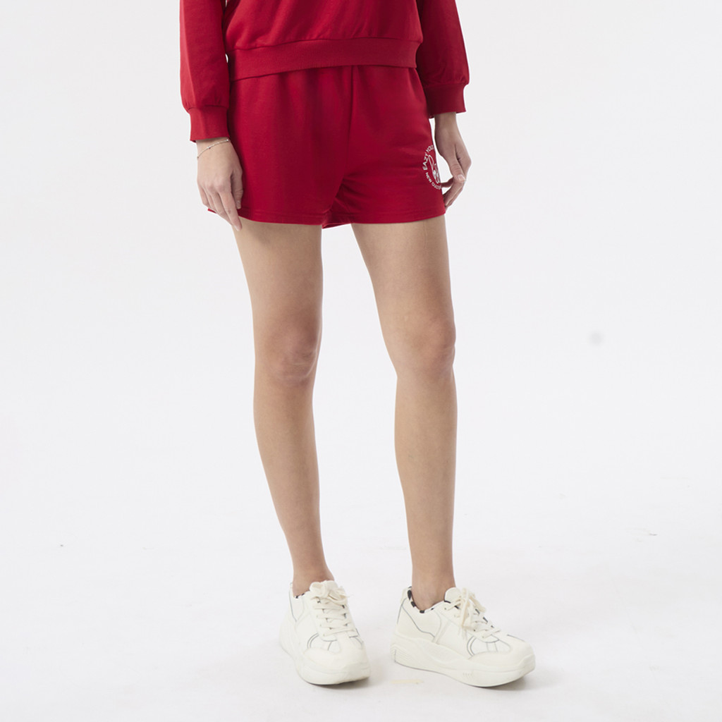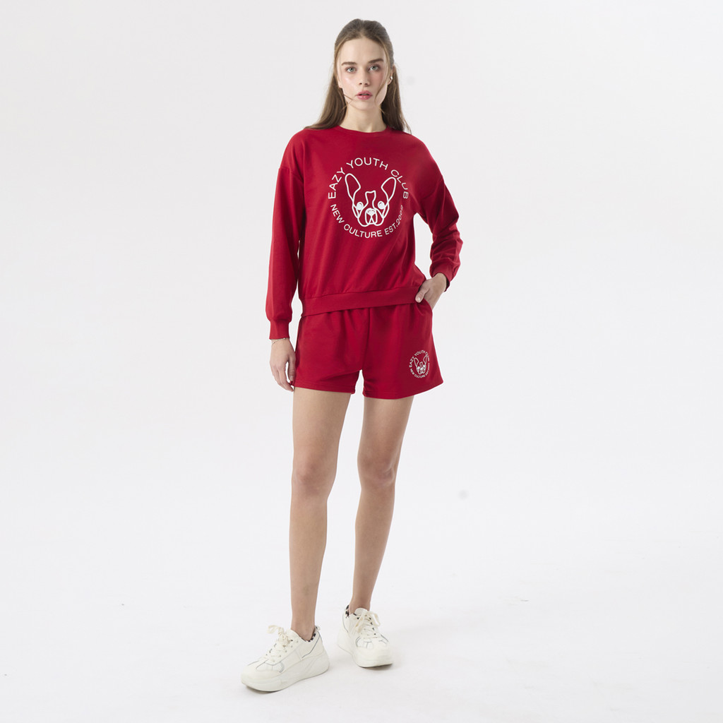กางเกงขาสั้น เฟรนช์ชี่ สีแดง มาพร้อมลายสกรีนสีขาว รูปซิกเนเจอร์ และตัวอักษร Eazy Youth Club New Cultue Est.2002 ล้อมรอบ ที่บริเวณขาด้านซ้าย ใส่สบายด้วยเอวยางยืดแต่งเชือกแบบจั๊มหัวสีขาว มีกระเป๋าสองข้างซ้าย-ขวา มาพร้อมเสื้อเข้าเซ็ต