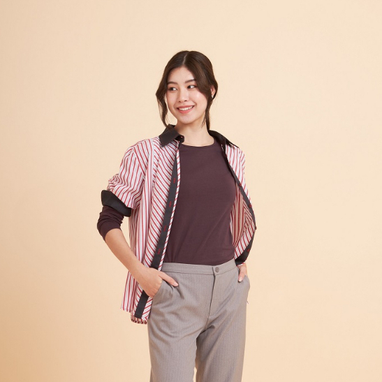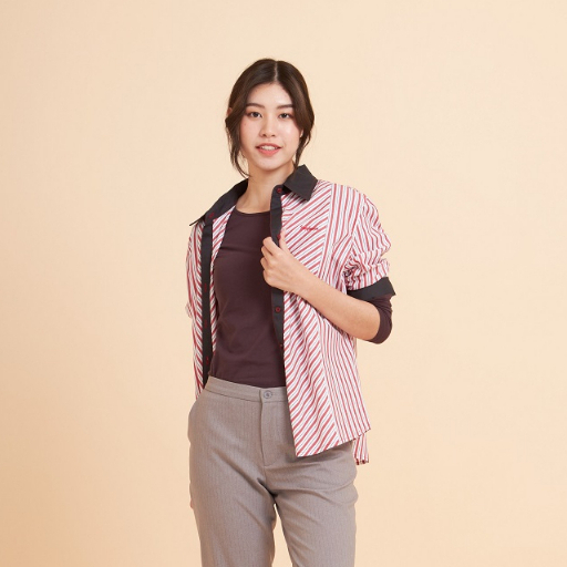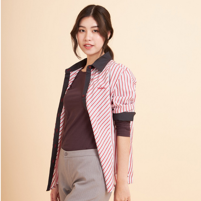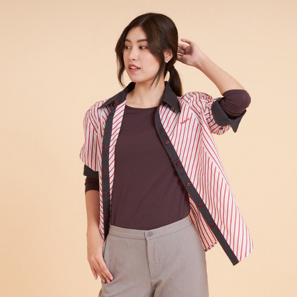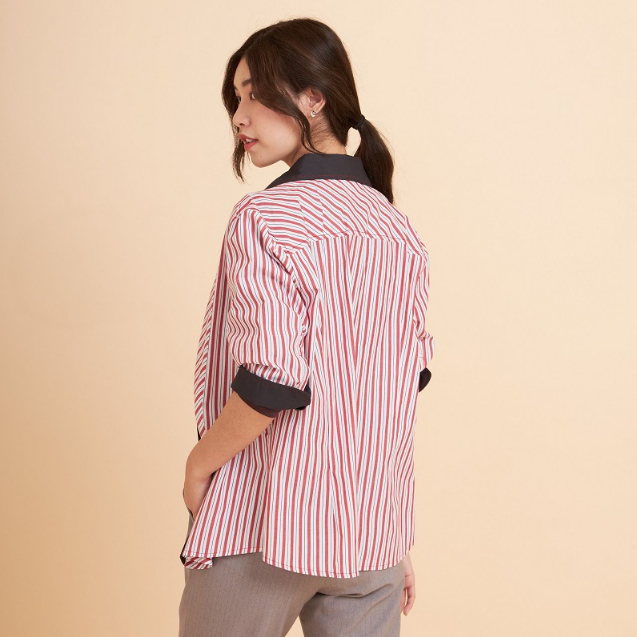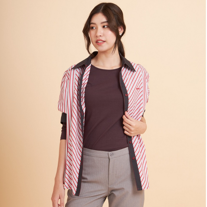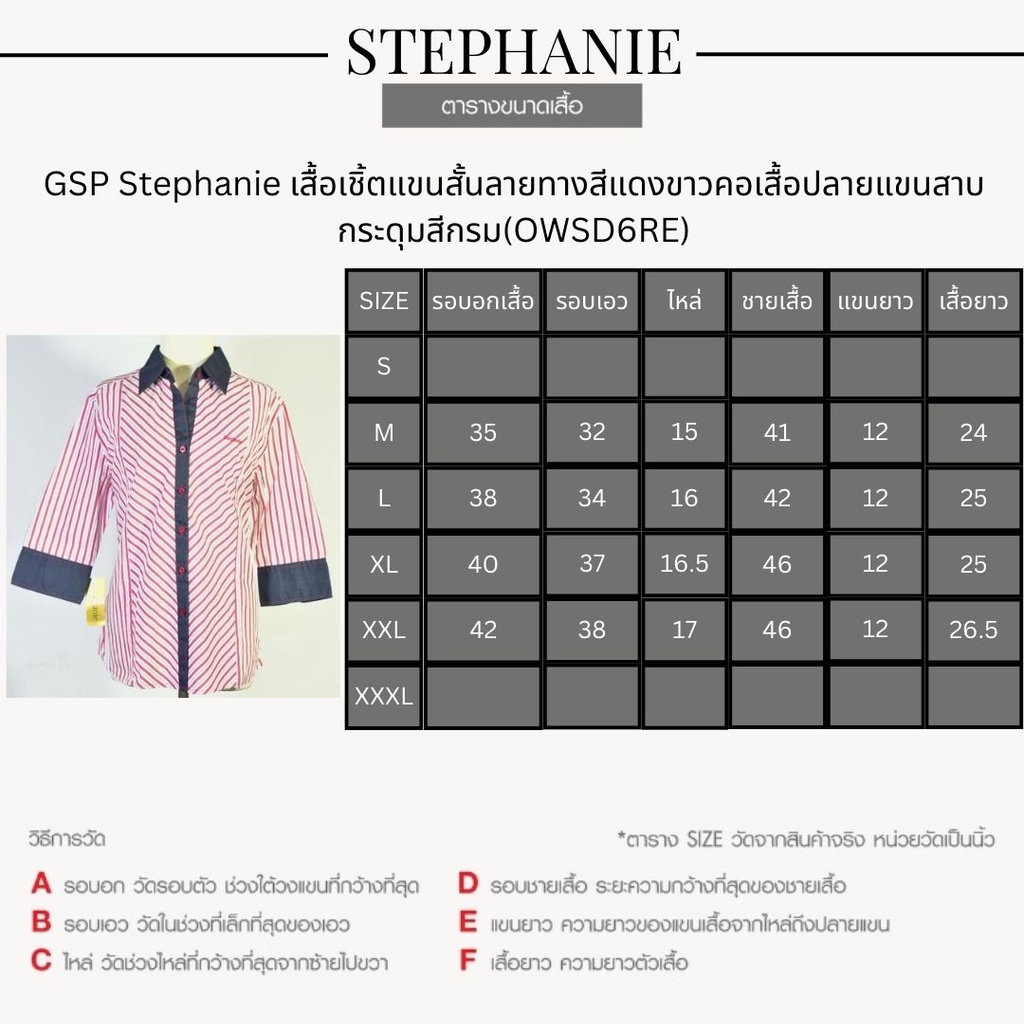 GSP Stephanie เสื้อเชิ้ตแขนสั้นลายทางสีแดงขาวคอเสื้อปลายแขนสาบกระดุมสีกรม(OWSD6RE)
