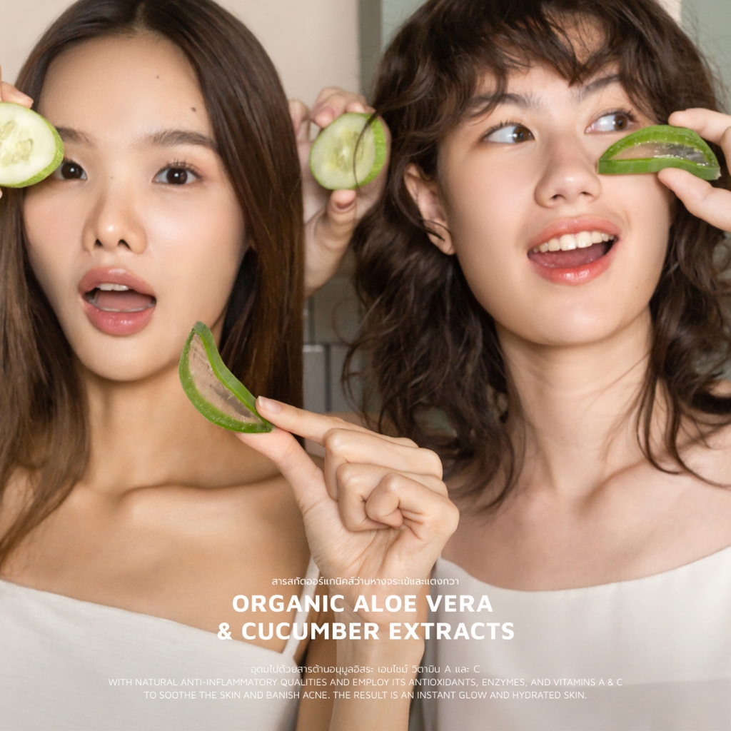 สารสกัดออร์แกนิกจากว่านหางจระเข้และแตงกวาอุดมไปด้วยสารต้านอนุมูลอิสระ เอนไซม์ วิตามิน A และ C ที่จะคอยช่วยปลอบประโลมผิว เติมความชุ่มชื้น และกำจัดสิวเสี้ยน อีกทั้งยังมีคุณสมบัติต้านการอักเสบตามธรรมชาติ ผลลัพธ์ที่ได้คือผิวเปล่งปลั่งเป็นประกายและชุ่มชื้นในทันที
