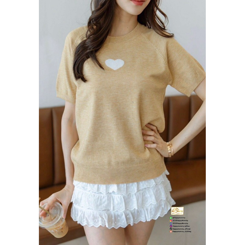 ดีไซน์ : เสื้อคอกลมแขนสั้น จั๊มอ่อนๆรอบปลายแขนและชายเสื้อ ช่วงตัวเสื้อปล่อย ไม่รัดรูป ทอสลับสีขึ้นลายหัวใจ