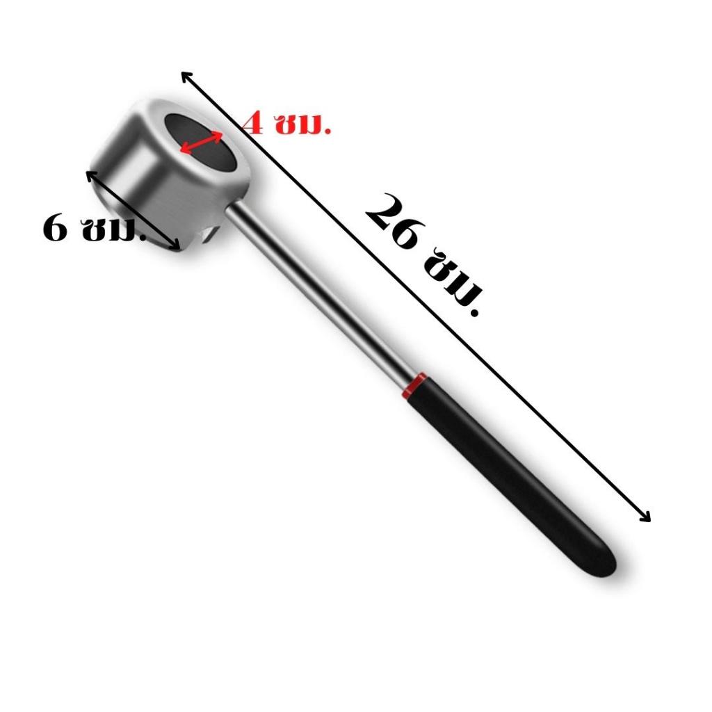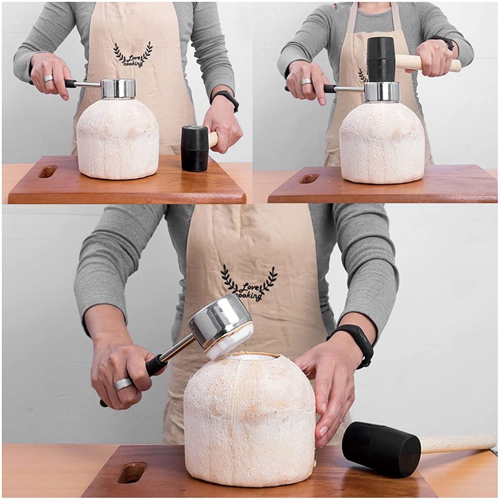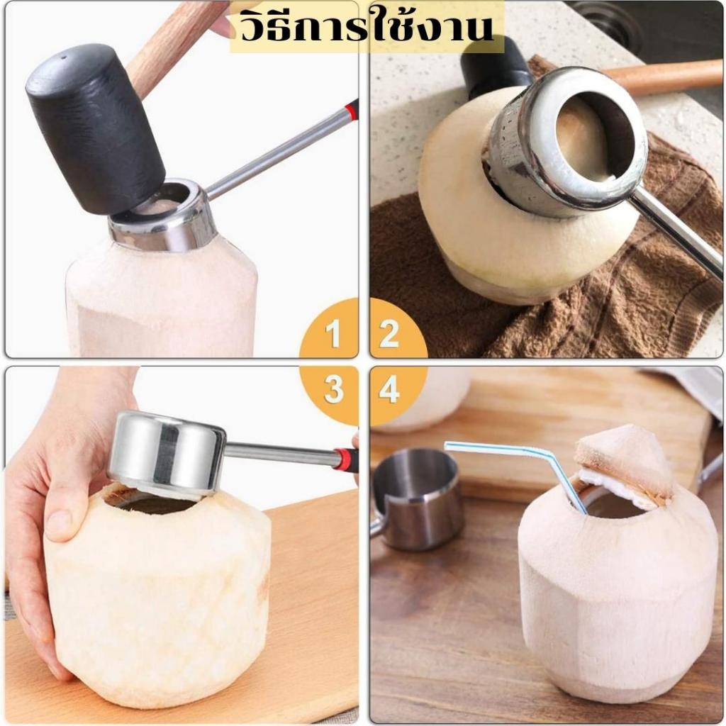 วิธีใช้ : วางตามตำแหน่งที่จะเปิด จากนั้นใช้ค้อนยางตีเพื่อเปิด สามารถเจาะลูกมะพร้าวได้ง่ายโดยใช้เวลาไม่กี่วินาที