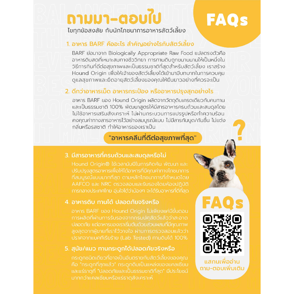 ไม่จำเป็นต้องเติมท็อปปิ้งใดๆ เนื่องจากสูตรอาหาร BARF ของ Hound Origin มีความสมบูรณ์และสมดุลในด้านโภชนาการ ครอบคลุมสารอาหารหลักและสารอาหารรองที่จำเป็นทั้งหมดกว่า 40 ชนิด คุณพ่อคุณแม่สามารถนำอาหารออกจากถุงให้น้องทานได้เลย แต่หากต้องการเพิ่มท็อปปิ้งบ้างเล็กน้อยเป็นครั้งคราวเพื่อให้น้องๆ ได้ตื่นเต้นกับการทานมากขึ้นก็ได้เช่นกัน
