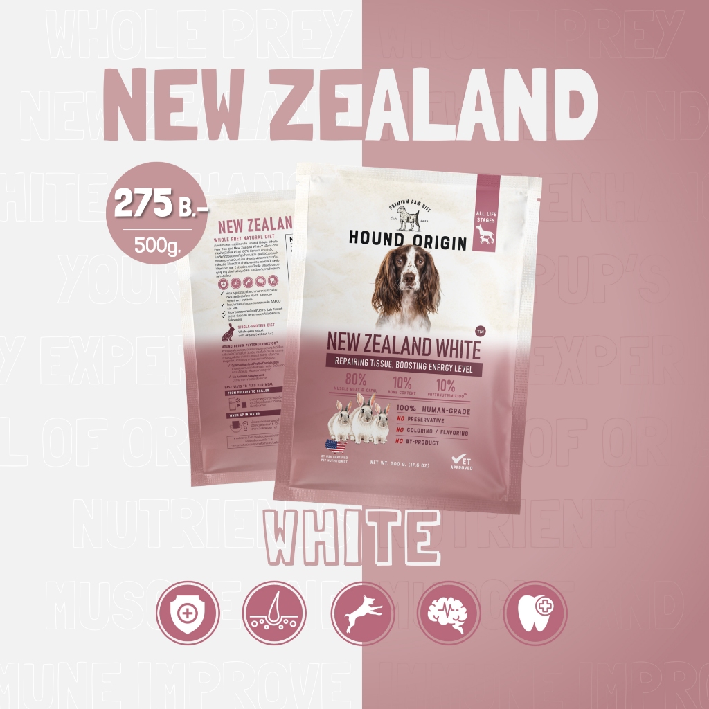 สัมผัสประสบการณ์นักล่ากับ สูตร New Zealand White™ เนื้อกระต่ายสายพันธุ์นิวซีแลนด์ไวท์ 100% ที่ถูกขนานนามว่าเป็นโปรตีนที่ดีต่อสุขภาพที่สุดสำหรับสุนัข อุดมไปด้วยคุณค่าทางสารอาหารฉบับเข้มข้น ส่งเสริมพัฒนาการทางด้านกล้ามเนื้อ ให้กรดอะมิโนจำเป็นครบถ้วน และยังเป็นแหล่ง Vitamin B และ E ช่วยซ่อมแซมเนื้อเยื่อ เสริมสร้างระบบภูมิคุ้มกัน ต่อต้านอนุมูลอิสระ และป้องกันการอักเสบได้อย่างดีเยี่ยม