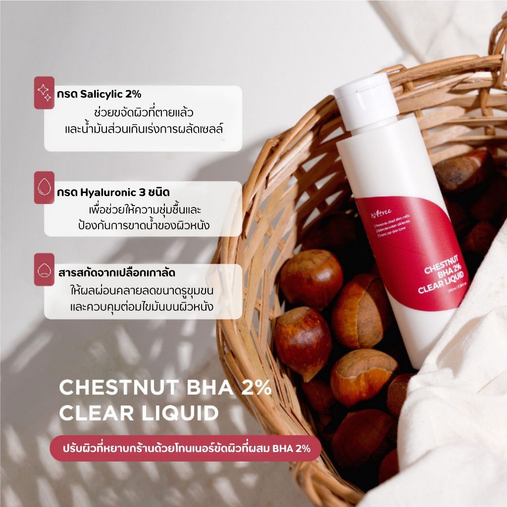 -ประกอบด้วยแทนนินที่สกัดจากเปลือกเกาลัด กระชับรูขุมขน ลดความมัน และคืนความสมดุลของน้ำและน้ำมันของผิว