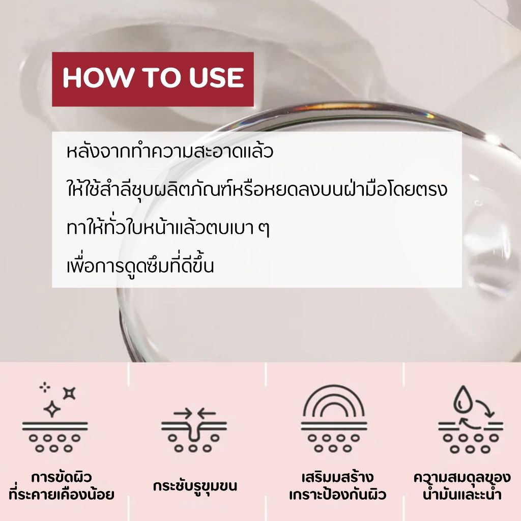 หลังจากทำความสะอาดผิวหน้าแล้ว ให้ใช้สำลีชุบผลิตภัณฑ์หรือหยดลงบนฝ่ามือโดยตรง ทาให้ทั่วใบหน้าก่อนตบเบา ๆ เพื่อการดูดซึมเพิ่มเติม