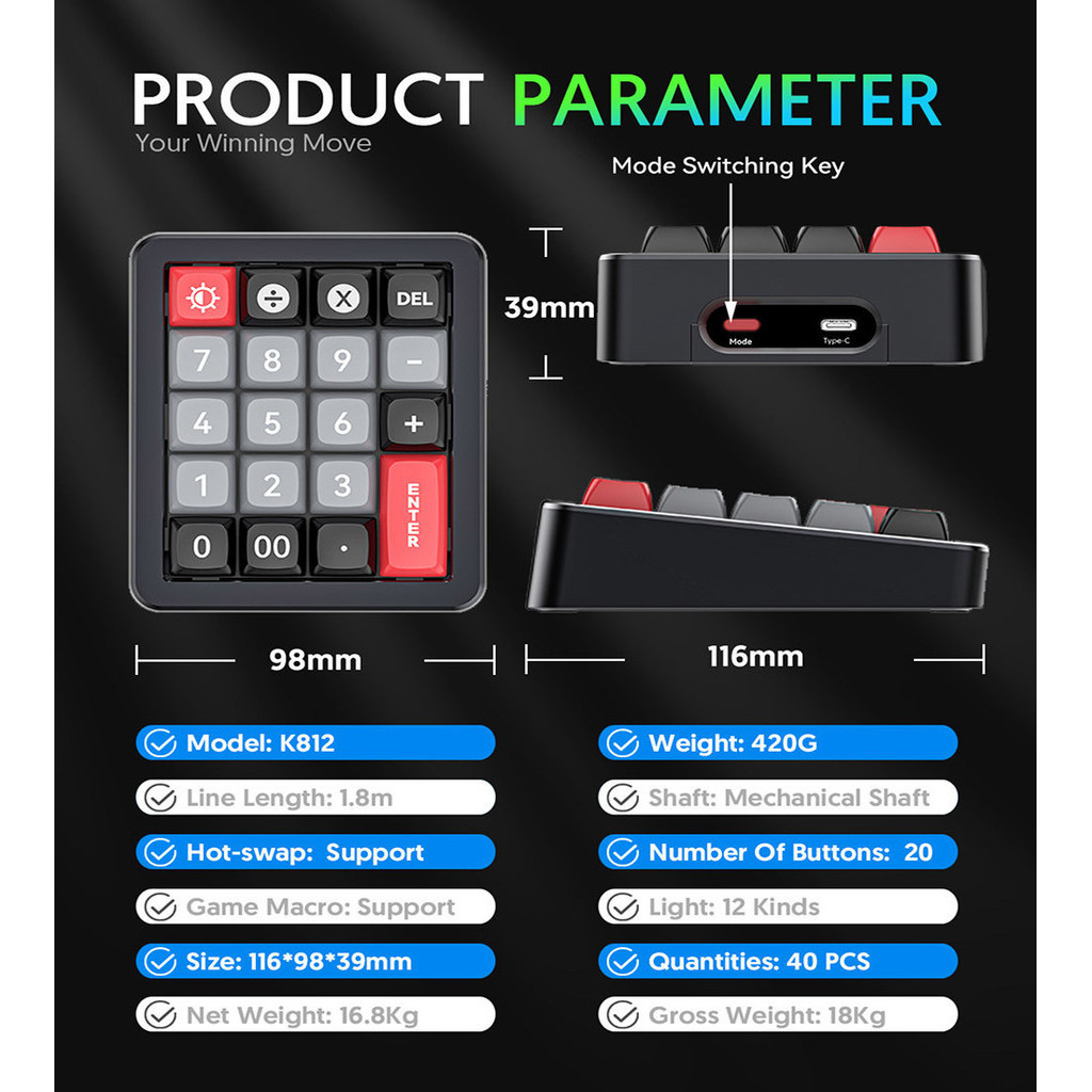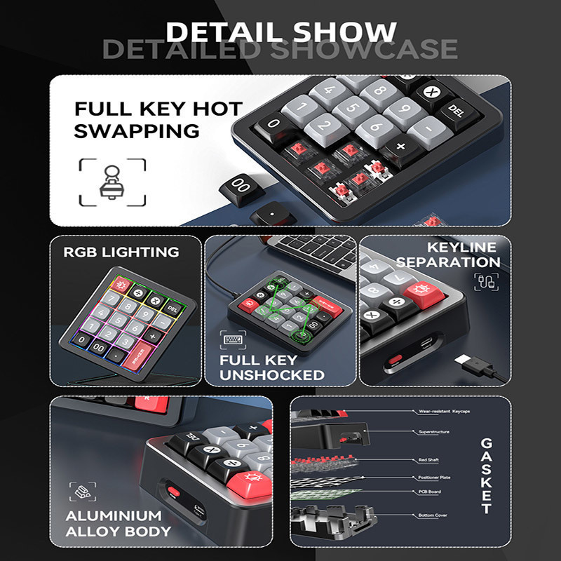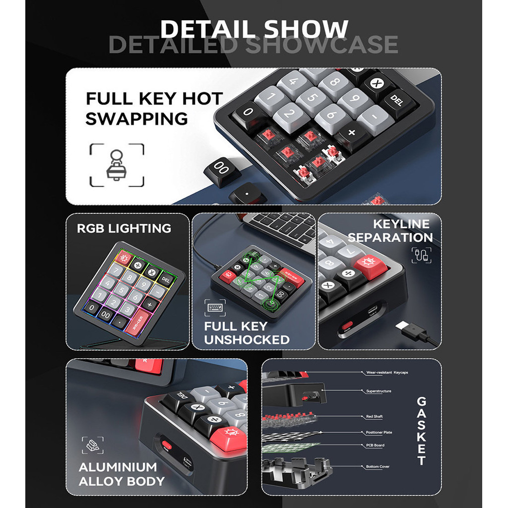แป้นพิมพ์ตัวเลขอลูมิเนียม, ปุ่มเต็มไฟแบ็คไลท์ RGB แบบหมุนได้ร้อน 19 ปุ่มคีย์บอร์ดตัวเลขแบบมีสาย Type-C สำหรับเดสก์ท็อป / แล็ปท็อป
