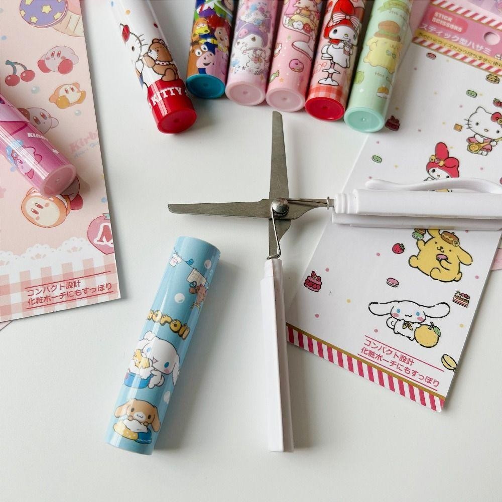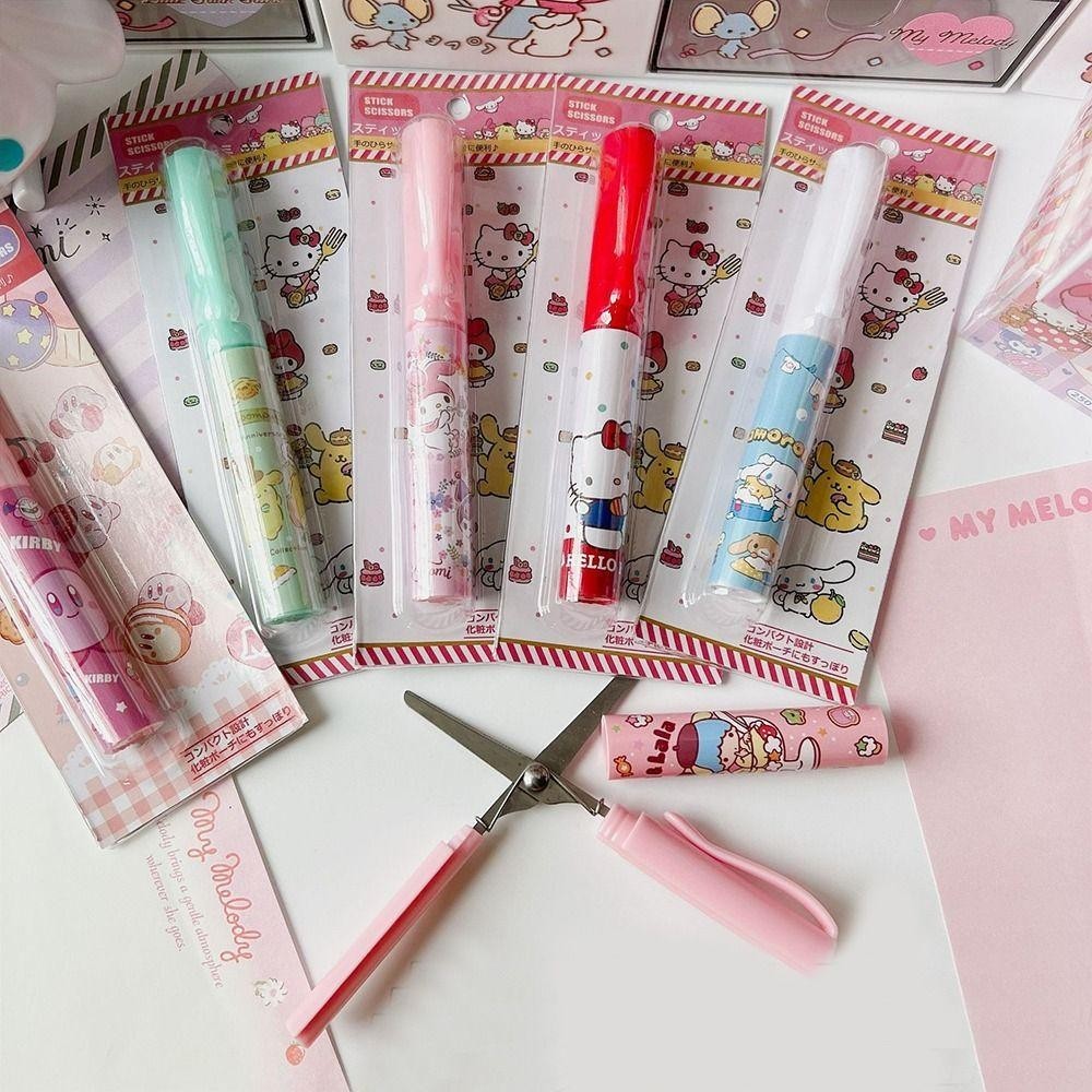 รูปทรงปากกากรรไกรมินิหัตถกรรมกรรไกรตัดกระดาษเครื่องมืองานฝีมือศิลปะการออกแบบพับได้ปลอดภัย Kuromi Kitty Cinnamoroll สแตนเลส DIY เครื่องมือนักเรียนสำนักงานเด็กแบบพกพาน่ารักมัลติฟังก์ชั่นแปลกใหม่