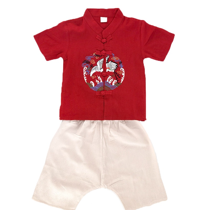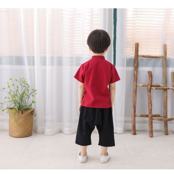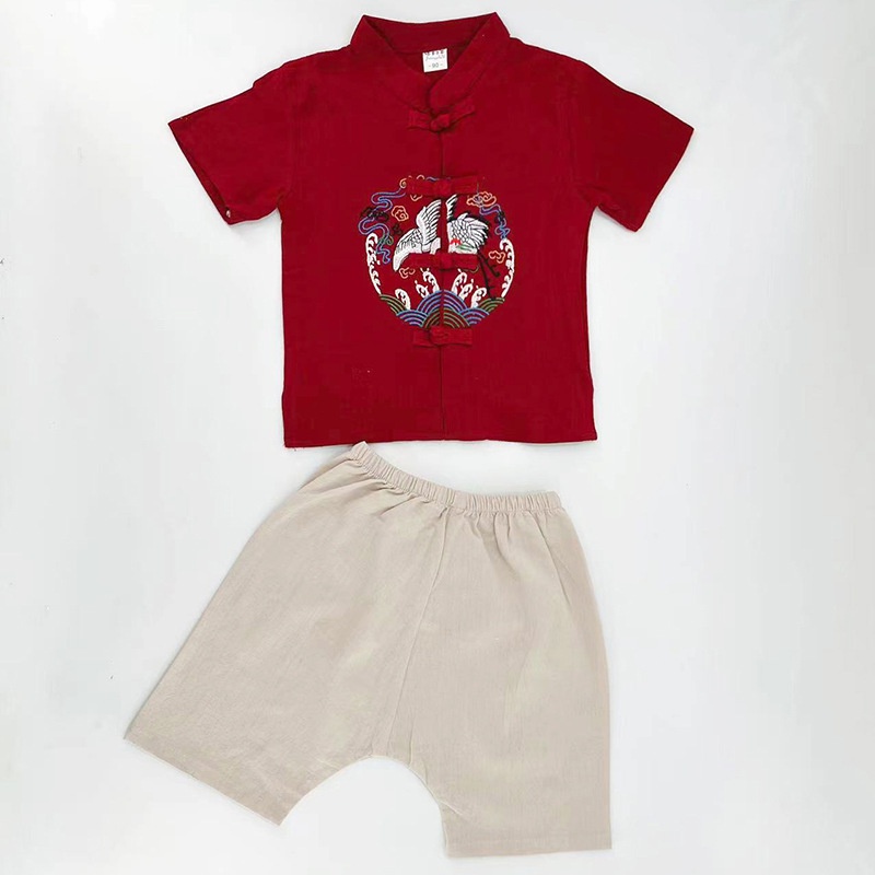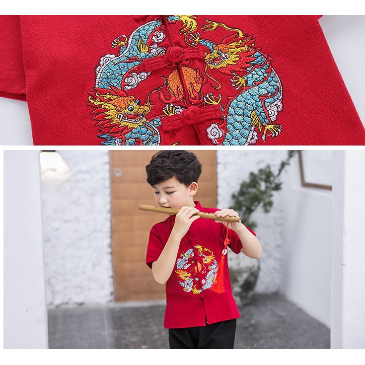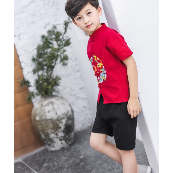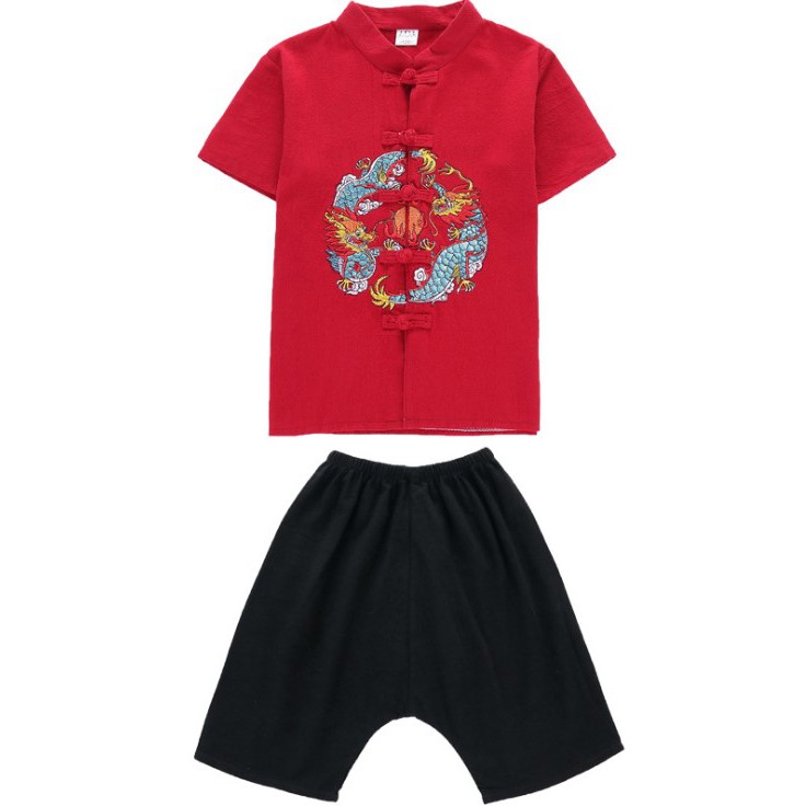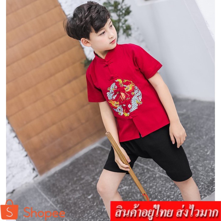 ชุดเซต 2 ชิ้น ชุดกี้เพ้าชาย เสื้อแขนสั้น กางเกงขาสั้น ลายมังกร ( สีแดง ) รุ่น A16