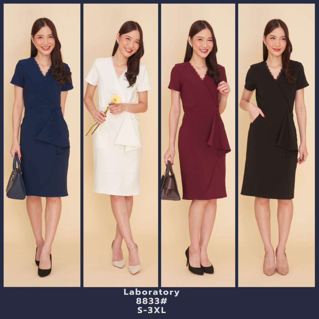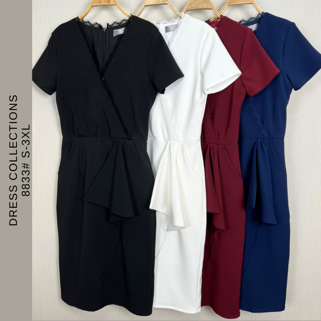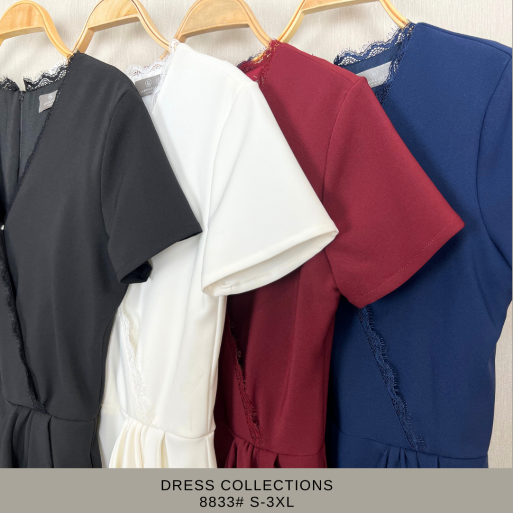 เดรส 8833# เดรสสีพื้นผ้าโพลีเอสเตอร์ผสมสแปนเดกซ์ เนื้อผ้านิ่มยืดหยุ่น ทำให้ชุดเป็นทรงสวย ยับยาก และยังใส่สบายอีกด้วย