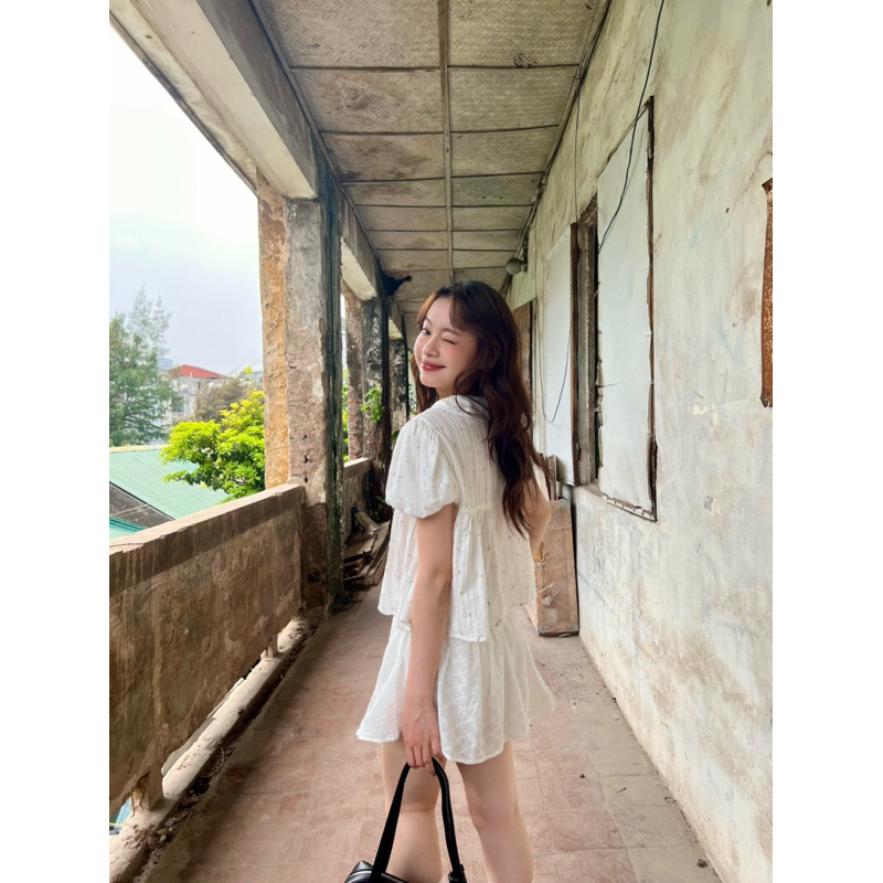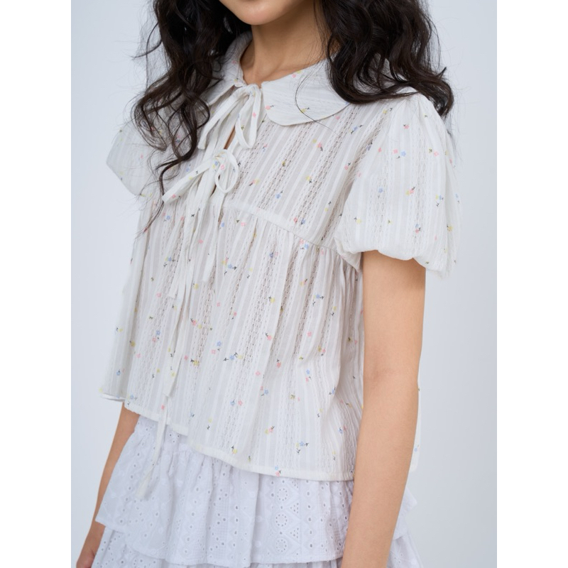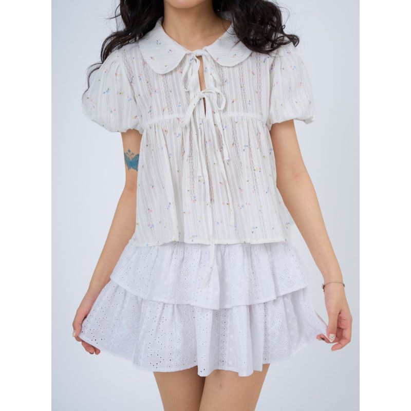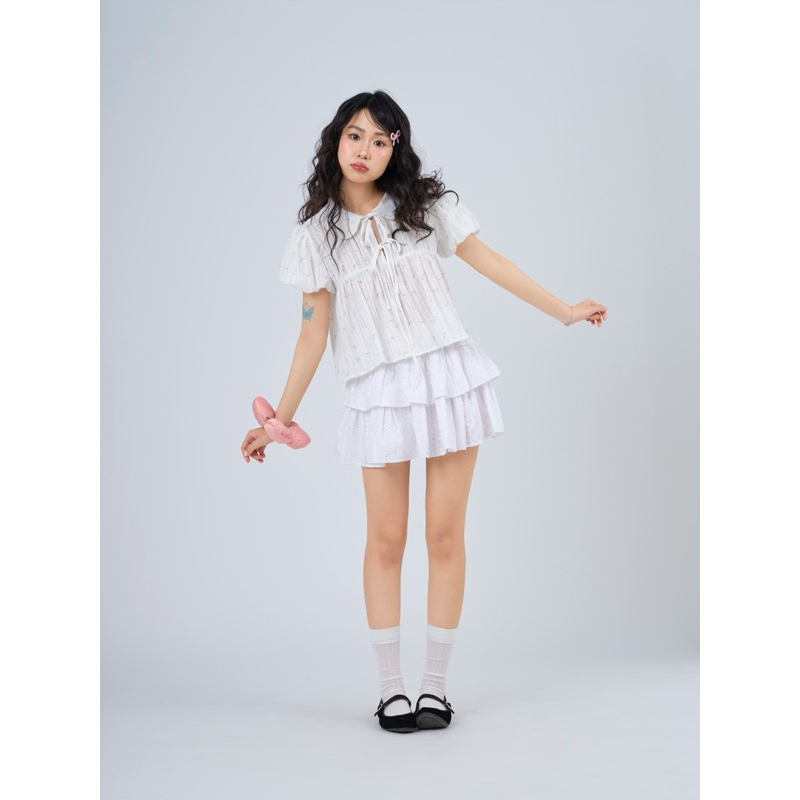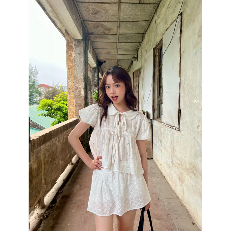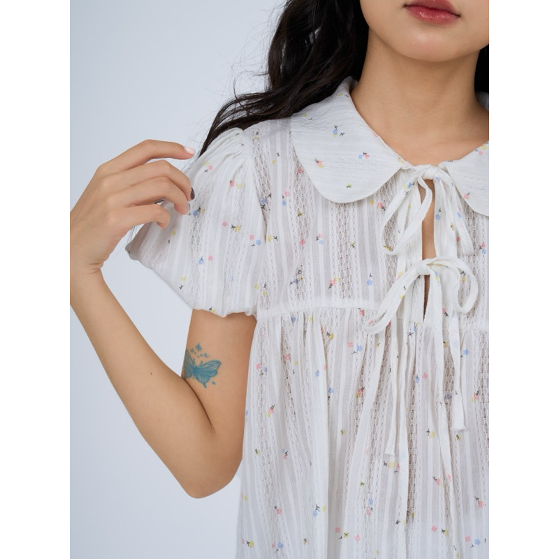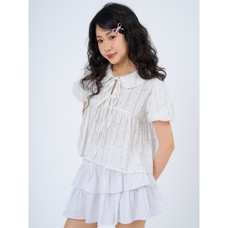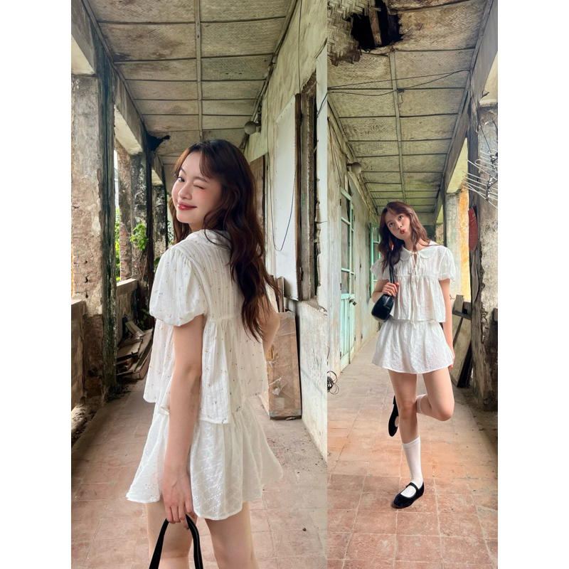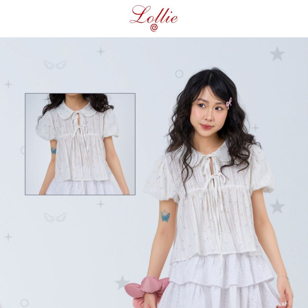 ยังคงสวมใส่ “ลมหายใจของเบบี้ดอลล์” แต่ออกแบบมาในรูปทรงของเสื้อเชิ้ตแขนพองคอบัวน่ารัก