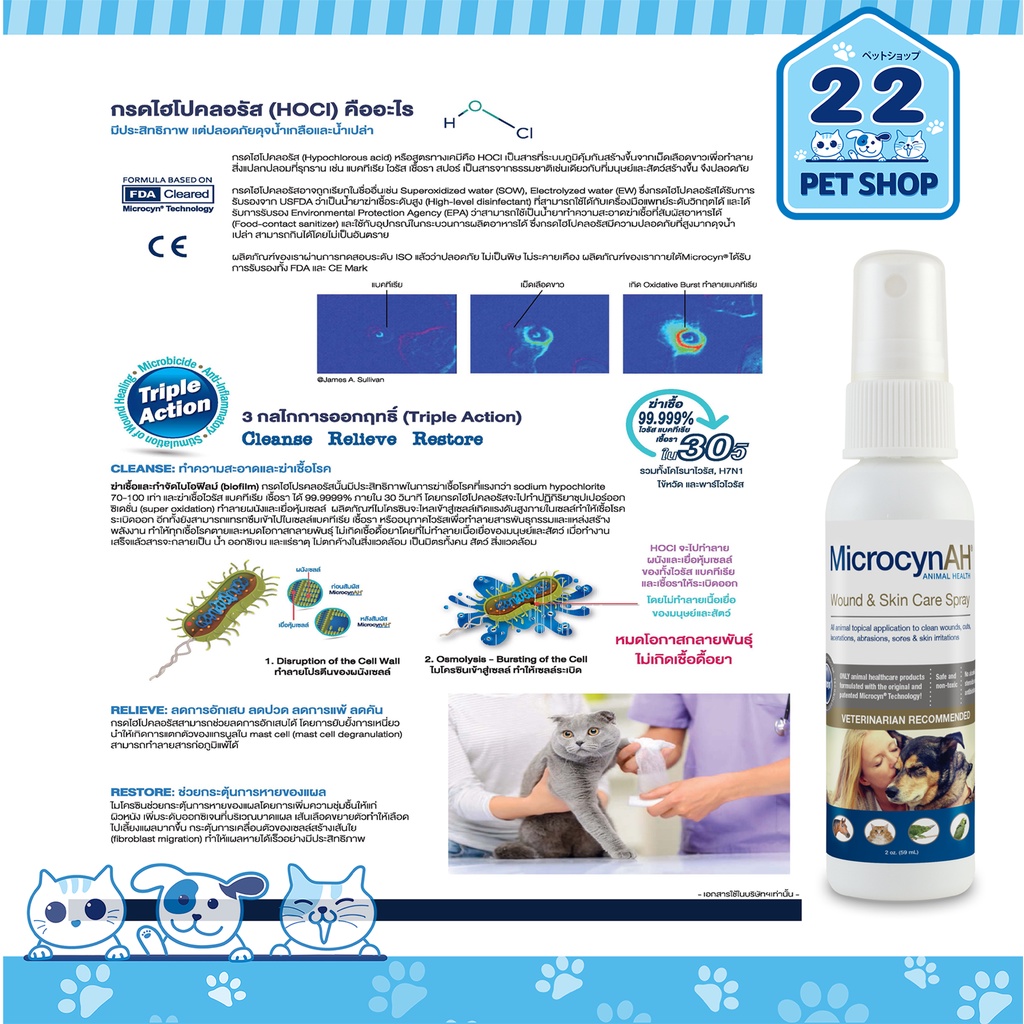 สเปรย์บำรุงผิวให้ความชุ่มชื้น ทำความสะอาดชะล้างและกำจัดเนื้อตาย ประกอบการรักษาแผล เช่น แผลหลังผ่าตัด แผลขอบเรียบ แผลถลอกแผลติดเชื้อเป็นหนอง แผลโดนกัด แผลหลุม ผิวหนังระคายเคือง แพ้แดง แผลเกา แผลไฟไหม้ แผลมีกลิ่นโดยใช้สารไฮโปคลอรัส ซึ่งเป็นสารเดียวกันกับที่ร่างกายสร้างขึ้น ปลอดภัยใช้ได้กับสัตว์ทุกชนิด