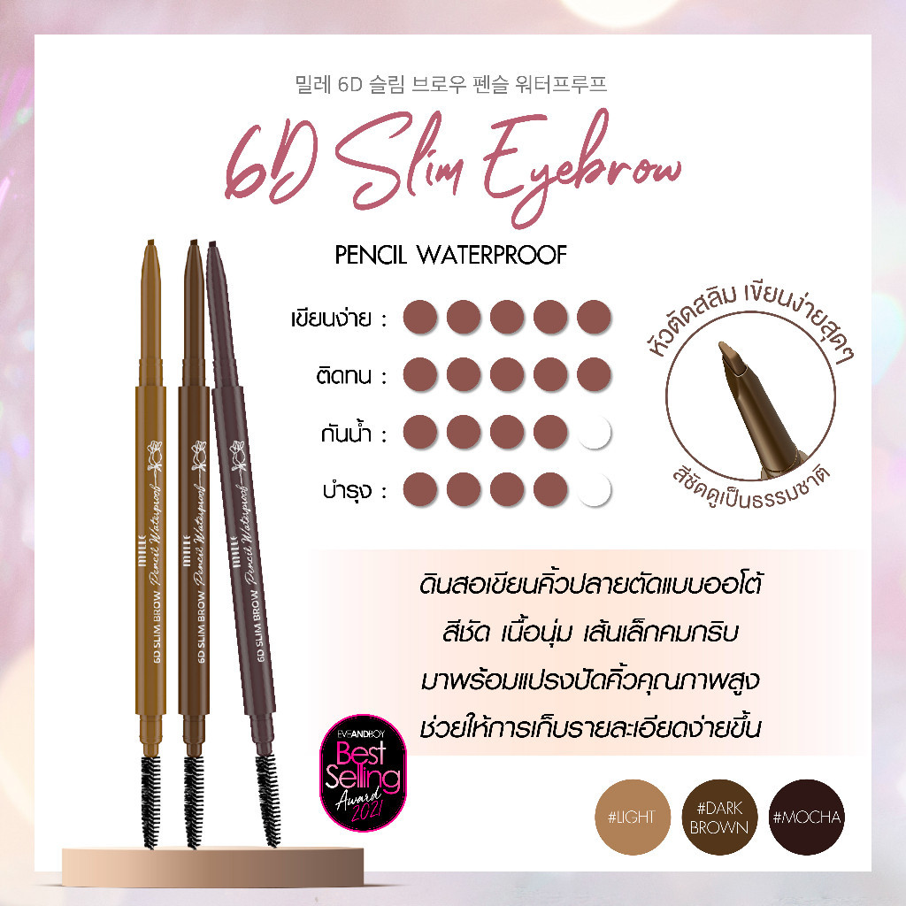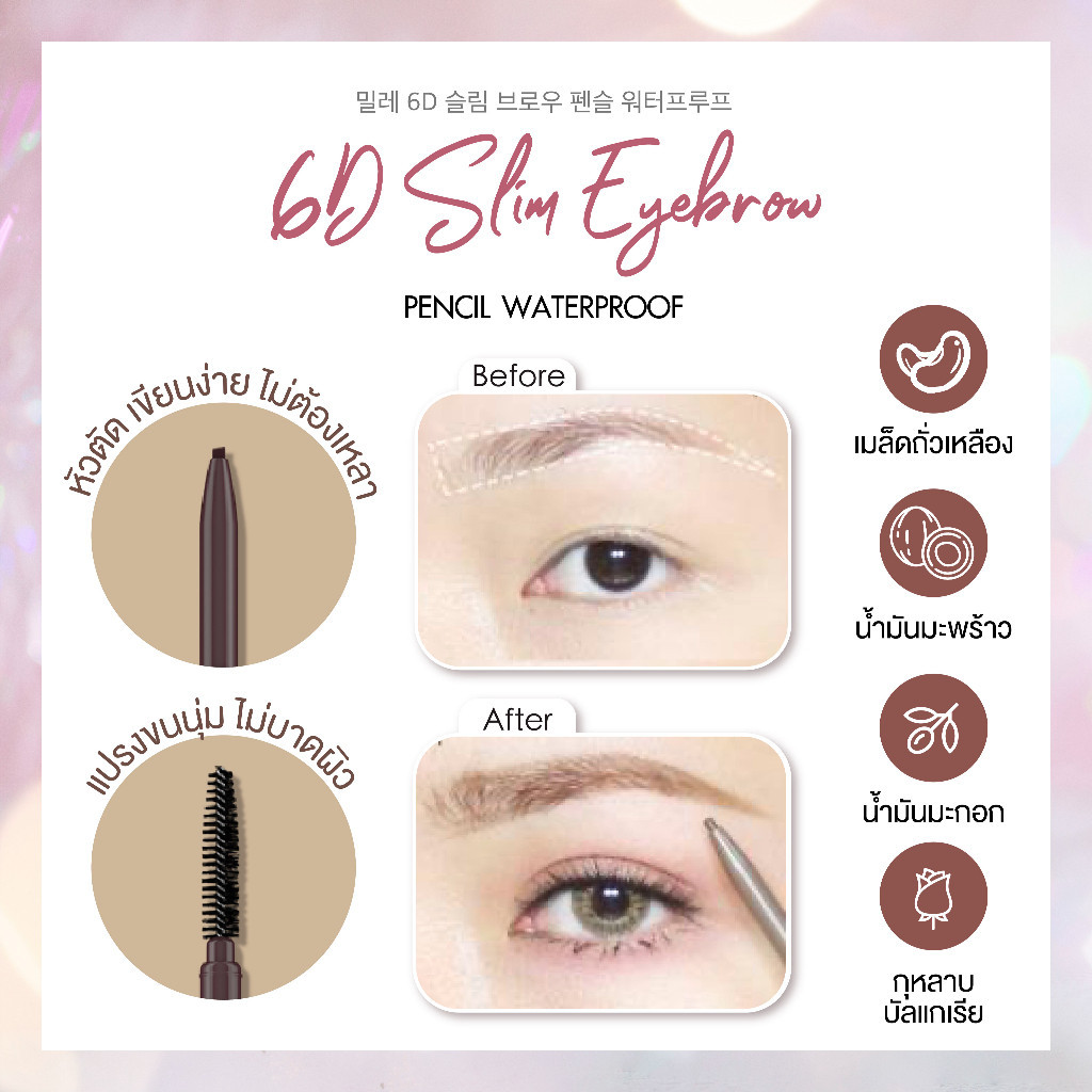 6D SLIM BROW PENCIL WATERPROOF ดินสอเขียนคิ้ว เพื่อความสมบูรณ์แบบของการเขียนคิ้วแบบเรียงเส้น ที่สร้างความโดดเด่นยิ่งขึ้น ด้วยรูปทรงดินสอที่ง่ายต่อการสร้างสรรค์ทรงคิ้วทุกรูปแบบของสาวๆ ช่วยแต่งแต้มคิ้วให้ดูมีมิติเพิ่มขึ้นถึง 6 มิติ สีสวยติดทนนาน กันน้ำ กันเหงื่อ