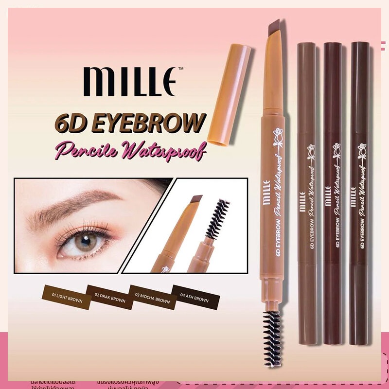 Mille 6D Eyebrow Pencil Waterproof 2gเลือกตกแต่งโครงคิ้วให้สวยงาม ไร้ที่ติ เสมือนผ่านการตกแต่งกับเทคโนโลยี 6D ด้วยดินสอเขียนคิ้วใหม่ล่าสุด ให้ความเรียบลื่น ช่วยให้การกำหนดองศาของกรอบคิ้วเสมือนผ่านการออกแบบด้วยช่างทำคิ้วผู้เชี่ยวชาญ พร้อมด้วยแรงบันดาลใจด้วยแพ็คเกจหรูหรา น่าพกพา พร้อมส่วนผสมที่คิดค้นมาจากธรรมชาติ อีกหนึ่งความงดงามที่อำนวยความสะดวกให้คุณได้อย่างครบวงจร