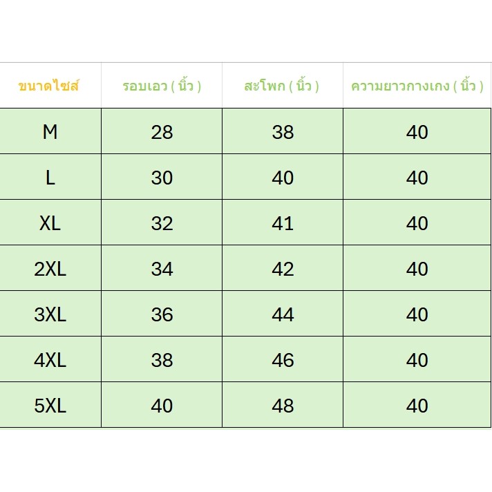 5XL เอว 40 นิ้ว สะโพก 48 นิ้ว รอบต้นขา 27 นิ้ว รอบปลายขา 16 นิ้ว กางเกงยาว 40 นิ้ว