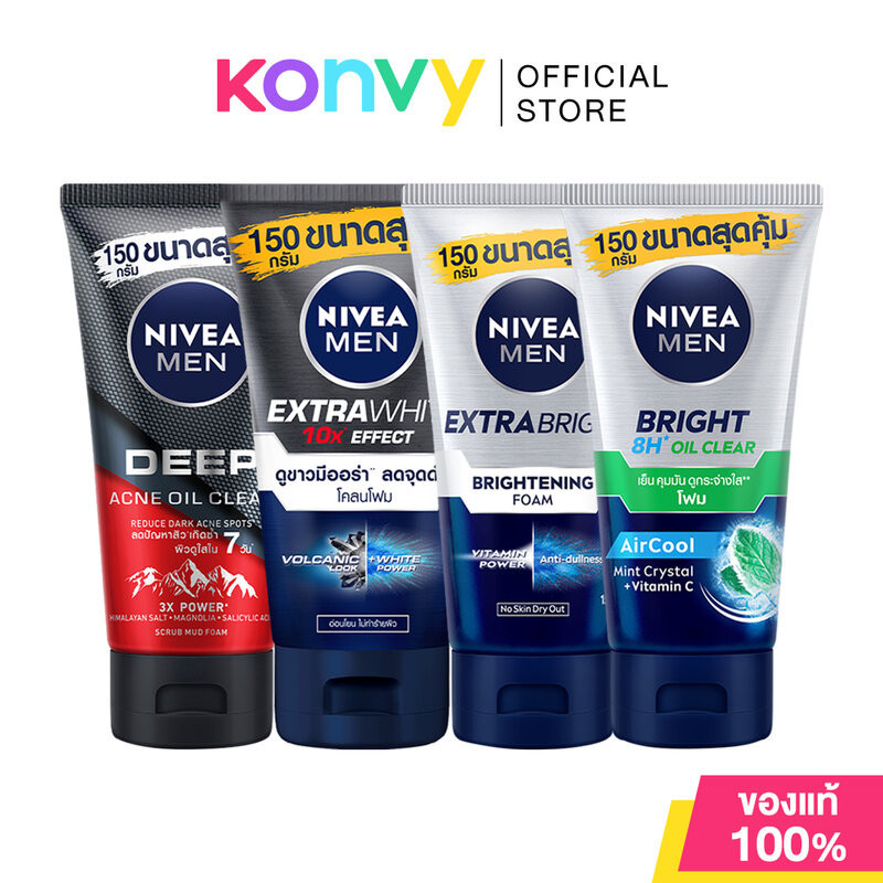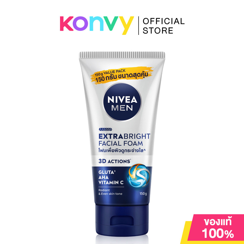 • NIVEA Men Extra Bright Foam 150g ผิวดูกระจ่างใส ไร้จุดด่างดำด้วยโฟมล้างหน้าสูตรควบคุมความมัน ลดเลือนจุดด่างดำ ผสานคุณค่าจากวิตามินและอาหารผิว 10 ชนิด ช่วยให้ผิวกระจ่างใส ไร้ความมันโดยไม่ทำให้ผิวบางไวต่อแดด มาพร้อมพลังทำความสะอาดลึกถึงร่องรูขุมขน ฟื้นฟูผิวคล้ำเสียมากให้กลับมากระจ่างใสอีกครั้ง