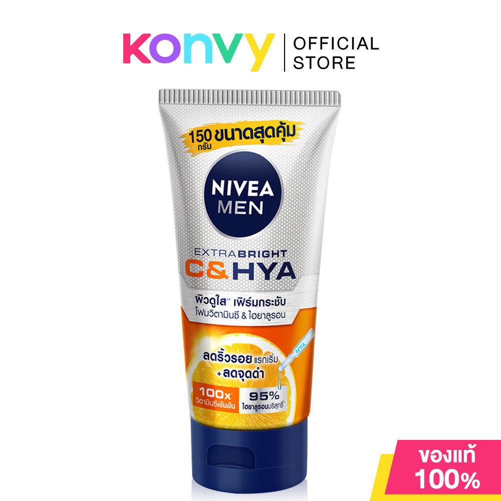 • NIVEA Men Extra Bright C&Hya Wash 150g โฟมล้างหน้าสำหรับผิวธรรมดา-มัน คล้ำเสียสะสมมาก อีกขั้นของโฟมเพื่อผิวดูใส เฟิร์มกระชับ ทำความสะอาดล้ำลึก ด้วยวิตามินซีเข้มข้น 100X ผสานไฮยาลูรอนบริสุทธิ์ ช่วยลดเลือนจุดด่างดำ ผิวดูกระจ่างใส และเรียบเนียนขึ้น