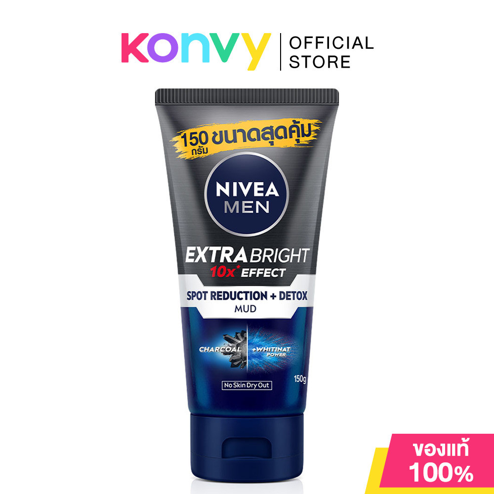 • NIVEA Men Extra Bright Face Mud Foam 150g โฟมล้างหน้าสำหรับผู้ชาย สูตรผิวดูกระจ่างใสออร่า ด้วยเนื้อคล้ายโคลนโฟมภูเขาไฟ ช่วยดีท็อกซ์ผิว ดูดซับสิ่งสกปรกและความมันฝังลึก พลังไวทิแนทจัดการความหมองคล้ำ และจุดด่างดำฝังลึก ผสานสารสกัดจากโสมและชะเอมเทศ ให้ผิวดูกระจ่างใสมีออร่า