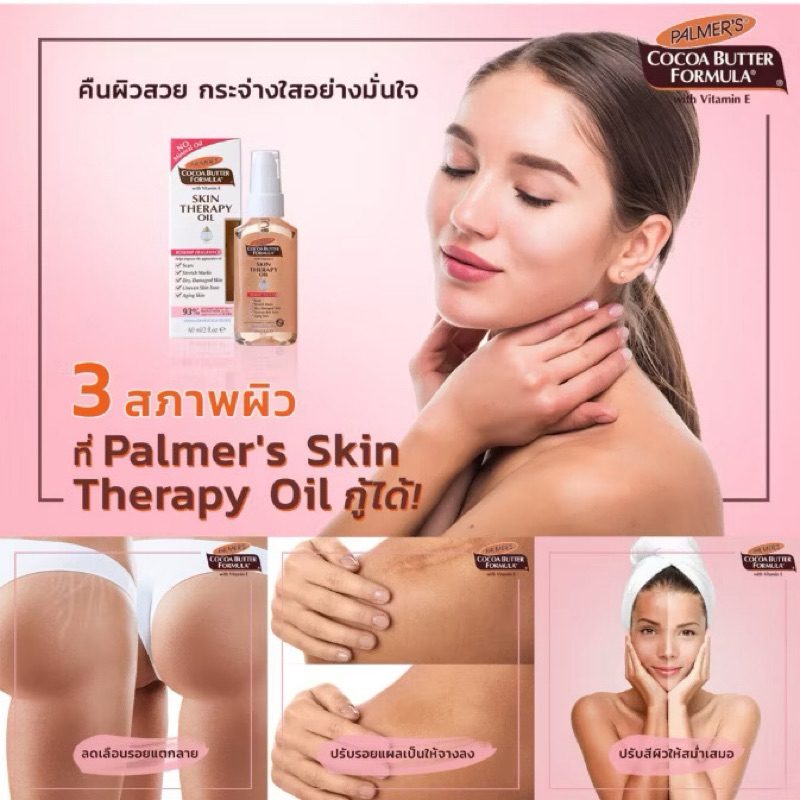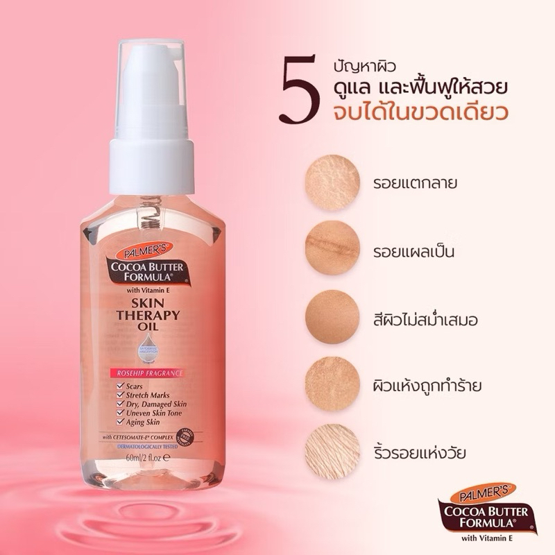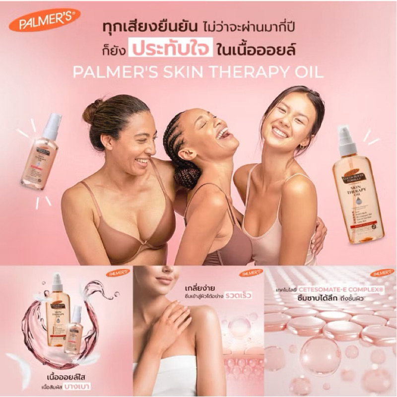 พรีเมียมออยล์บำรุงให้ผิวเนียนกระจ่างใส มีส่วนผสมของออยล์สกัดเข้มข้น 5 ชนิด ได้แก่ Canola Oil, Sesame Oil, Argan Oil, Sunflower Oil, Rose Hips Oila เทคโนโลยี Cetesomate-E ที่มีเฉพาะของ Palmer’s ทำให้เนื้อออยล์ซึมลึกเข้าสู่ผิวได้อย่างรวดเร็ว และไม่ทิ้งความเหนอะหนะไว้บนผิวช่วยเพิ่มความชุ่มชื้น ช่วยลดริ้วรอยแห่งวัย ปรับสีผิวให้สม่ำเสมอ ลดรอยแตกลายและรอยแผลเป็นป้องกันและลดรอยแตกลายให้จางลงได้ภายใน 2 เดือน ผ่านการทดสอบว่าปราศจากวิตามินเอและสารเคมีที่อันตราย ปลอดภัยต่อคุณแม่และเด็กในครรภ์