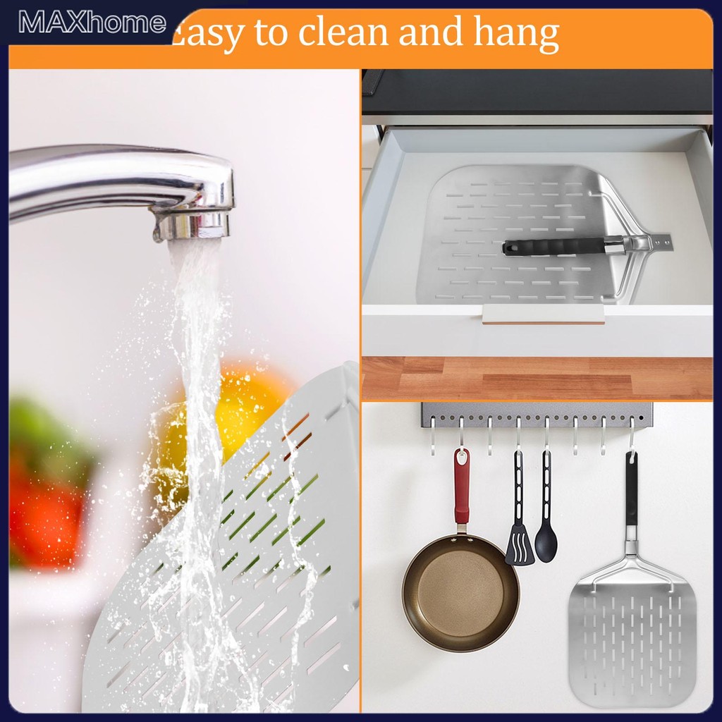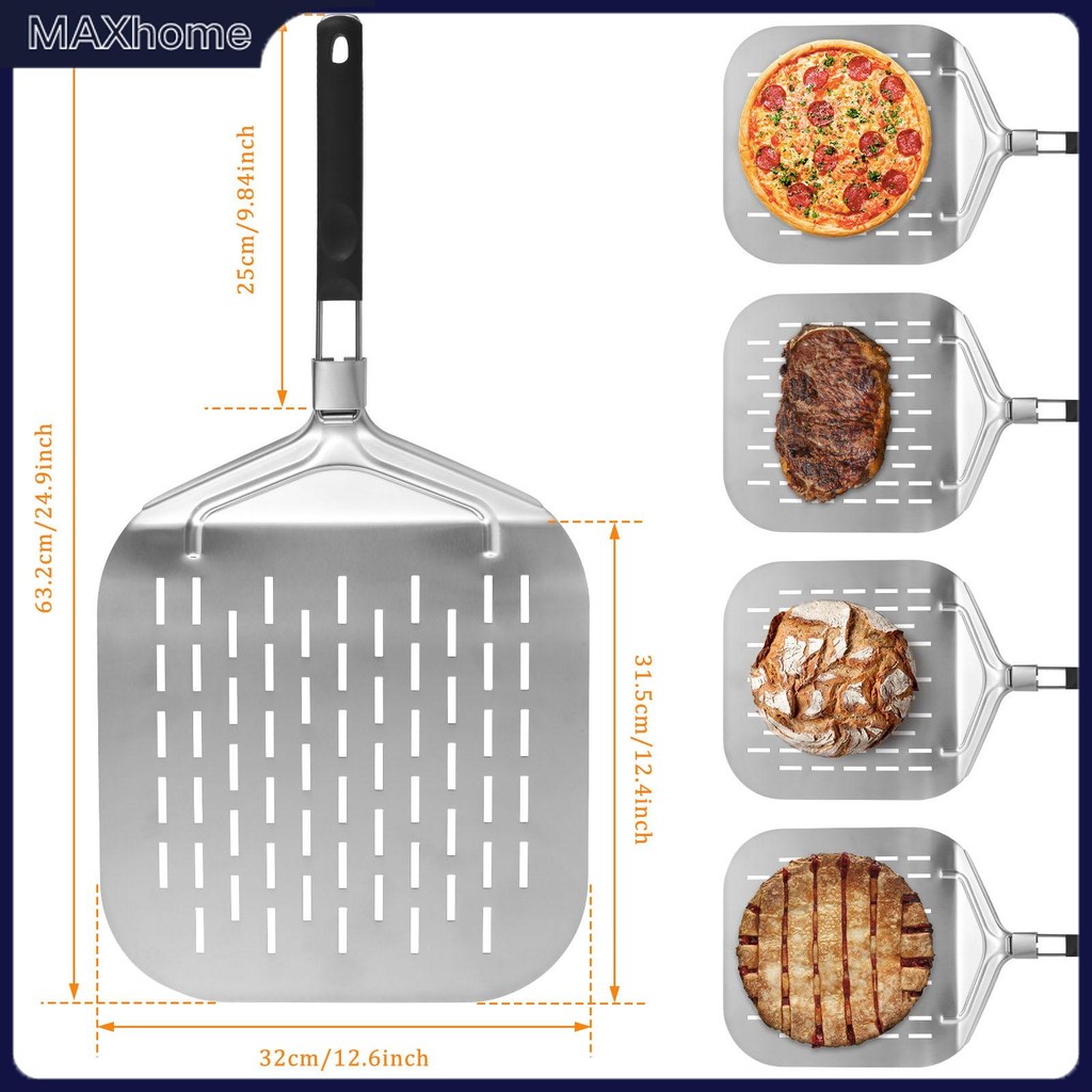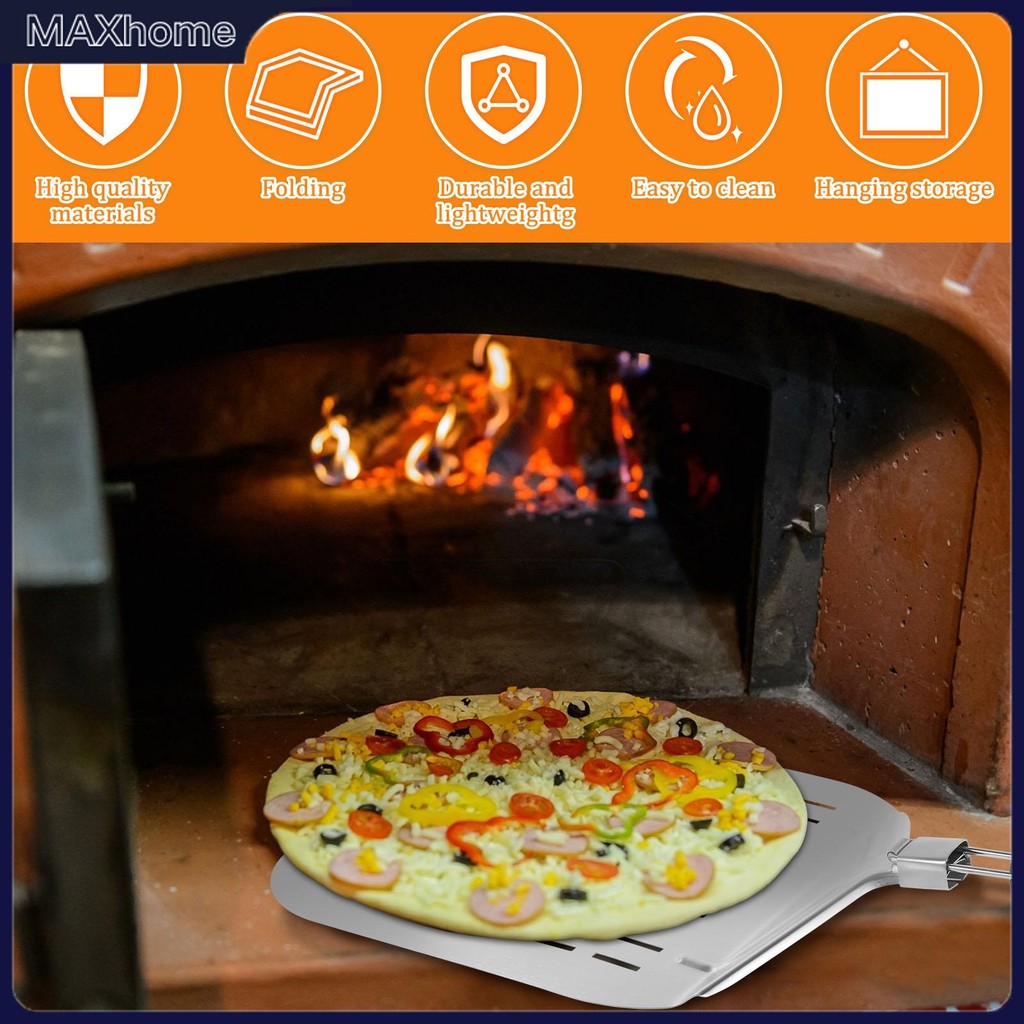 [perforated Pizza peel and Folding Handle] เปลือกพิซซ่าแบบเจาะรูนี้ช่วยลดแรงเสียดทานและช่วยให้แป้งส่วนเกินหลุดออกได้ง่ายทำให้ด้านล่างของพิซซ่ากรอบและรสชาติดีขึ้นในขณะที่รักษาเตาอบให้สะอาดและเป็นระเบียบเรียบร้อย เปลือกพิซซ่าแบบเจาะรูช่วยให้อากาศไหลเวียนได้ดีและช่วยให้พิซซ่ากรอบ นอกจากนี้ยังมาพร้อมกับที่จับพับได้เพื่อความสะดวกในการจัดเก็บและพกพาเมื่อออกไปตั้งแคมป์หรือปิกนิก