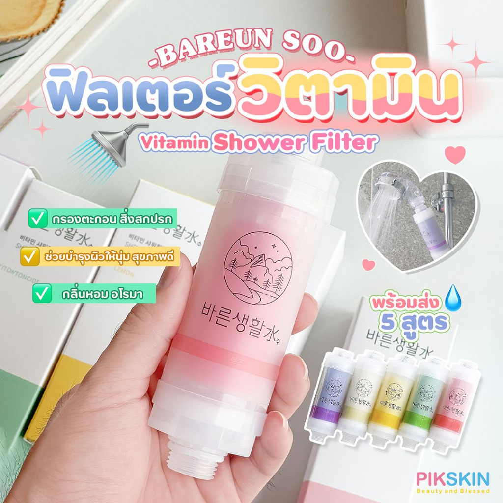 ฟิลเตอร์วิตามินกรองน้ำ Bareunsoo ช่วยกรองน้ำที่เราอาบให้สะอาด มีกลิ่นหอมให้เลือกหลายกลิ่น ช่วยบำรุงผิว ช่วยให้ผิวสุขภาพดีขึ้น เหมือนได้ฮีลลิ่งตอนอาบน้ำ ชำระล้างความเหนื่อยล้าของวันออกไป สามารถต่อกับก็อกหรือฝักบัวได้ด้วยตัวเอง เพียงเท่านี้ก็สามารถอาบน้ำที่สะอาดบริสุทธิ์ ดีต่อผิวพรรณได้อย่างง่ายดาย