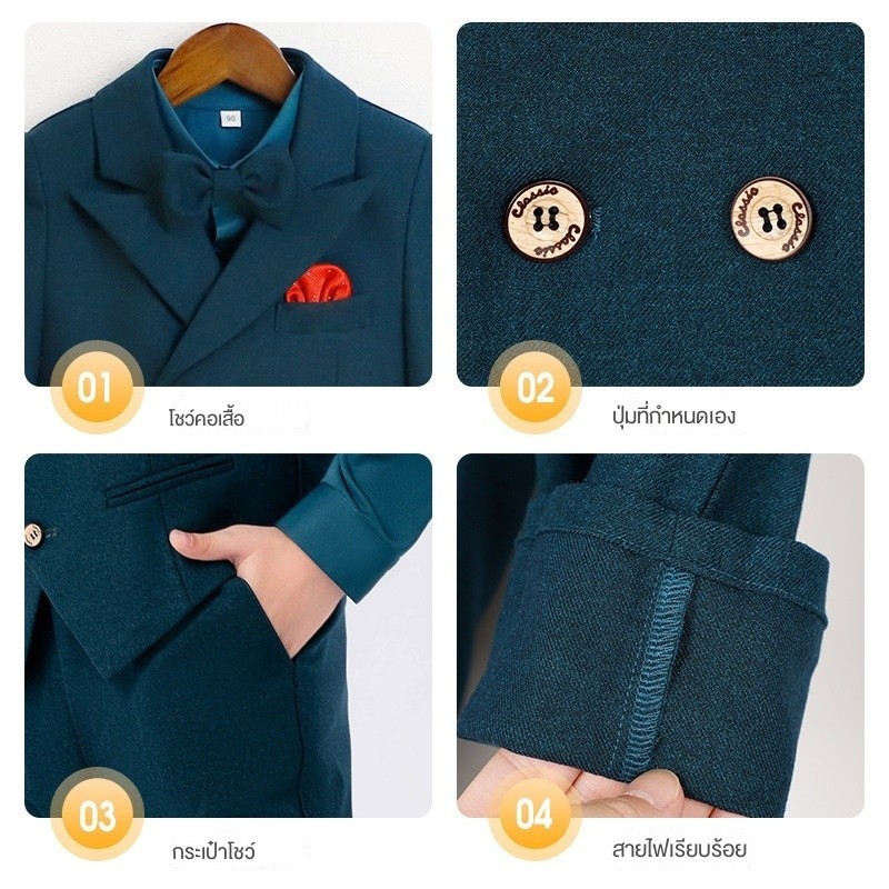 ชุด 5 ชิ้น (ชุด + เสื้อ + กางเกงขายาว + เน็คไท + กระเป๋า), สีเขียวเข้มชุด 6 ชิ้น (เสื้อ + เสื้อกั๊ก + กางเกงขายาว + เน็คไทโบว์ + กระเป๋าเสื้อ), ชุด 6 ชิ้นสีเขียวเข้ม (เสื้อ + เสื้อ + เสื้อ + เสื้อกั๊ก + กางเกงขายาว + เน็คไทโบว์ + กระเป๋า ผ้าขนหนู)
