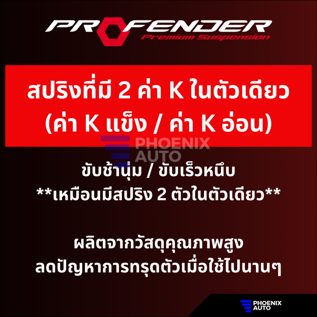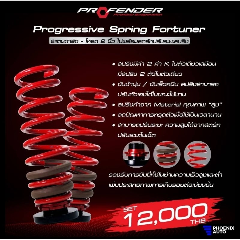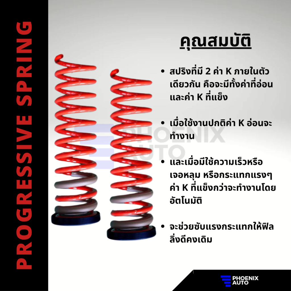 สปริง PROGRESSIVE รถโตโยต้า ฟอร์จูนเนอร์ ที่มี 2 ค่า K ภายในตัวเดียวกัน คือจะมีทั้งค่า K ที่อ่อน และค่า K ที่แข็ง เมื่อใช้งานปกติค่า K อ่อนจะทำงาน และเมื่อมีใช้ความเร็วหรือ เจอหลุม หรือกระแทกแรงๆ ค่า K ที่แข็งกว่าจะทำงานโดยอัตโนมัติ จะช่วยซับแรงกระแทกให้ฟิลลิ่งดีคงเดิม