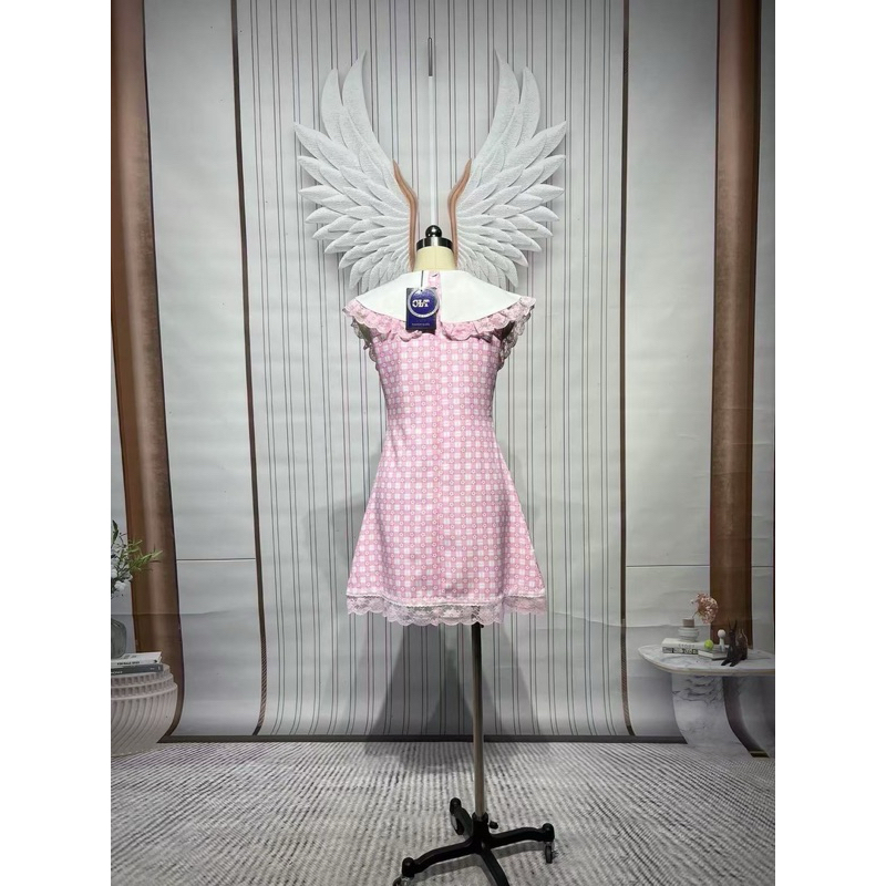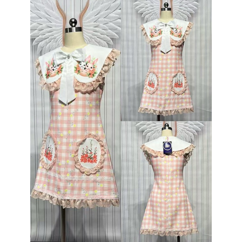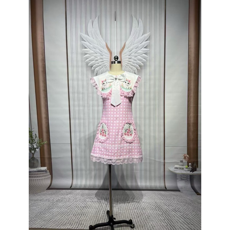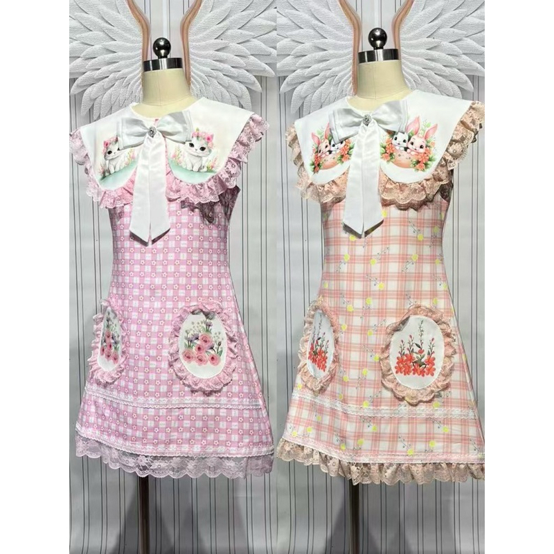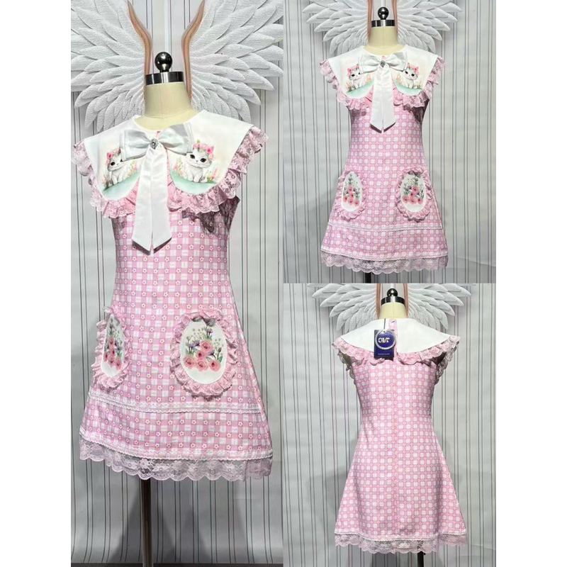 (s-7xl) เดรสสั้น คอปก ลายสก็อต ลายแมว สีพาสเทล งานป้าย chalita