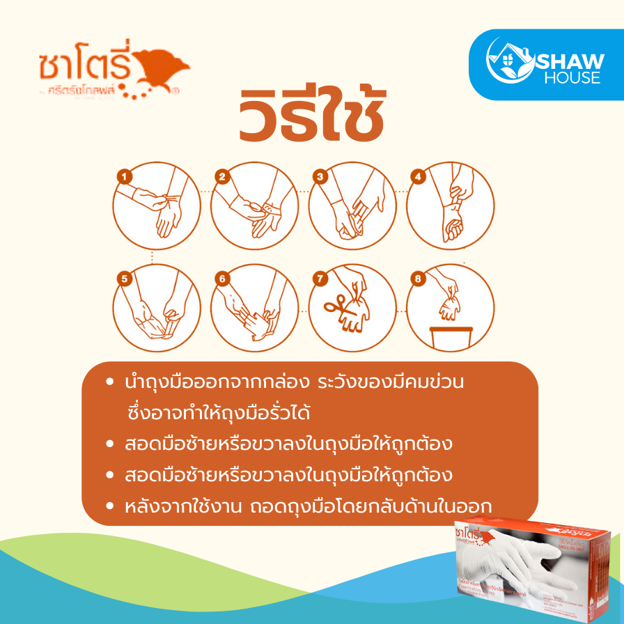 – นำถุงมือออกจากกล่อง ระวังของมีคมข่วน ซึ่งอาจทำให้ถุงมือรั่วได้