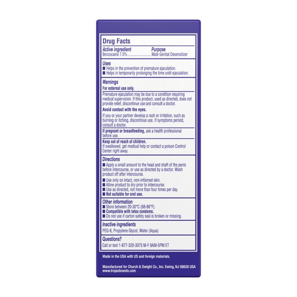 – Pull an all nighter. Extended Pleasure Delay Spray is an innovative new product from Trojan™ that helps you last longer and keep the pleasure coming. The spray features the active ingredient Benzocaine, 7.5%, a male genital desensitizer that helps prevent premature ejaculation. Apply a small amount to the head and shaft of the penis before intercourse. Wash product off after intercourse.