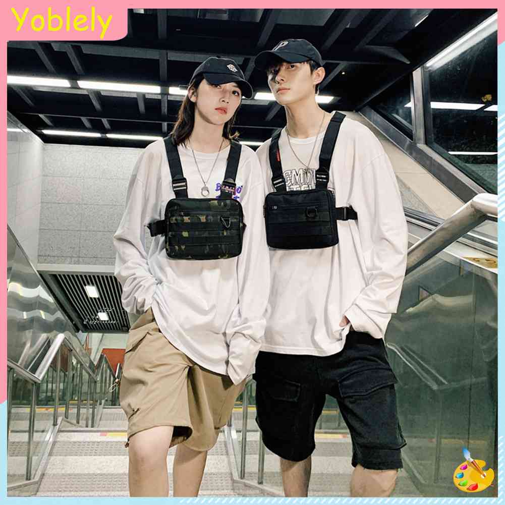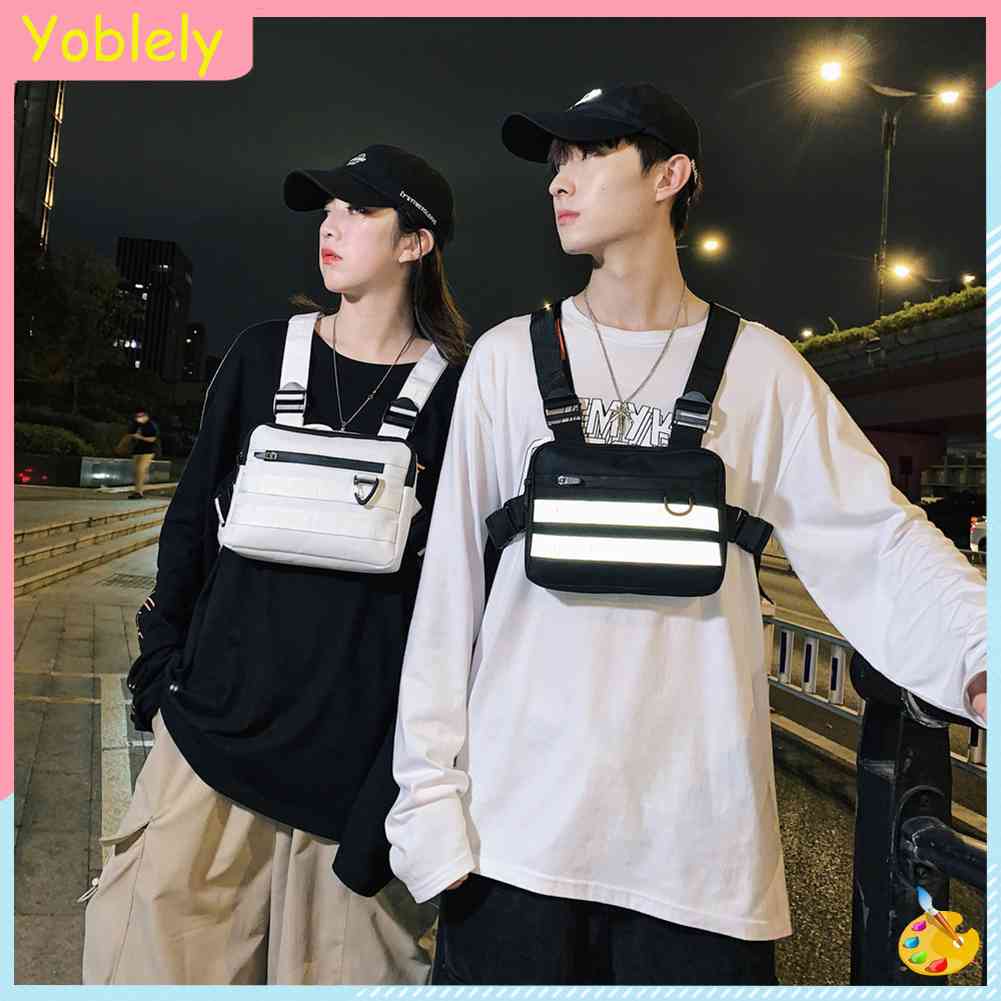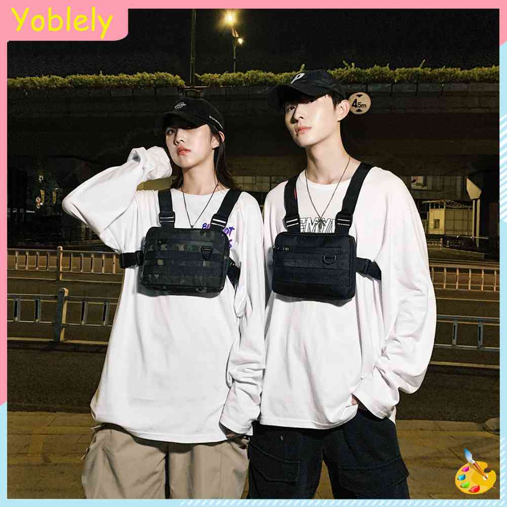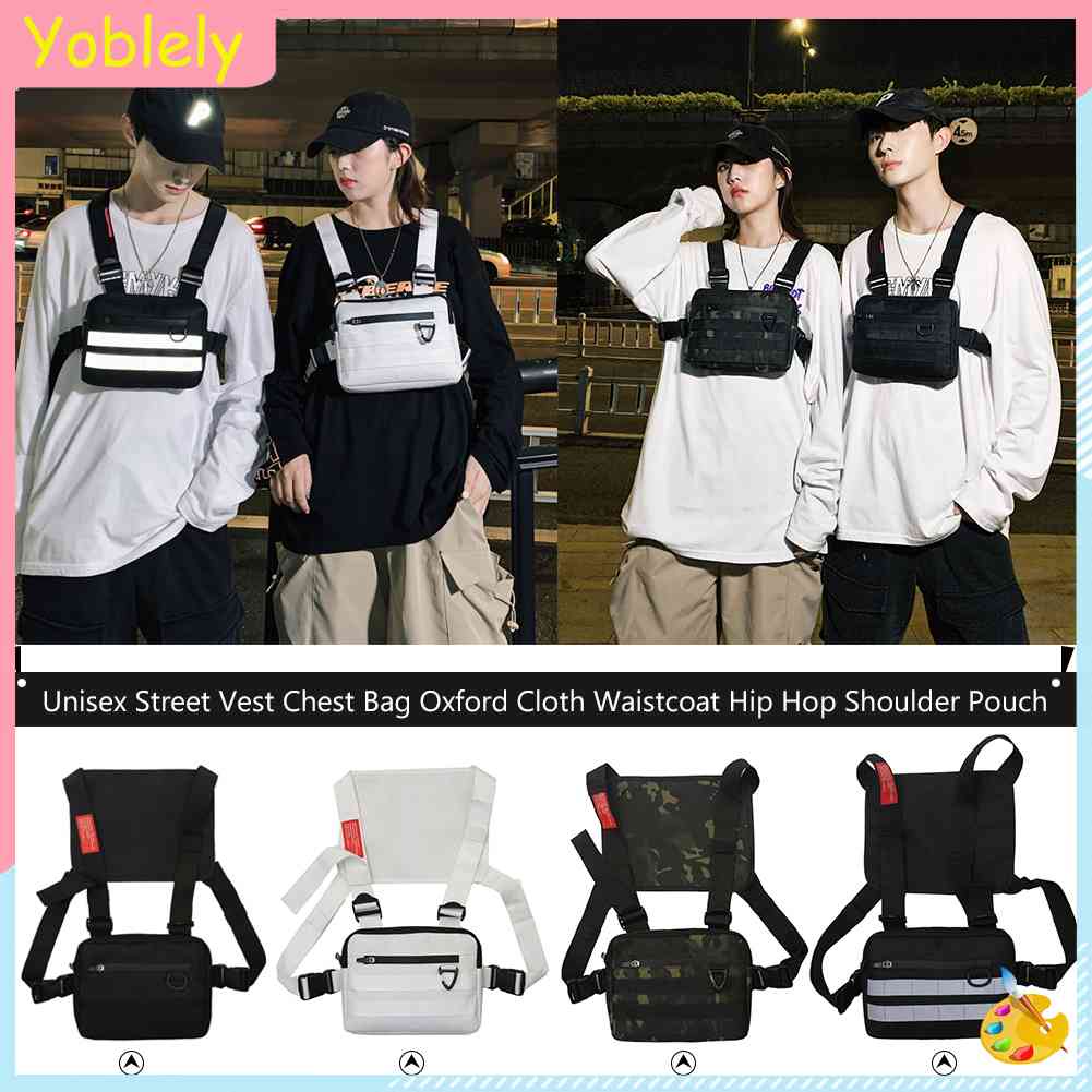 เสื้อกล้ามมัลติฟังก์ชั่นหน้าอกกระเป๋าสะพายผู้ชายผู้หญิงผ้า Oxford แฟชั่นเสื้อคลุมฮิปฮอปสตรีทกระเป๋าเข็มขัด
