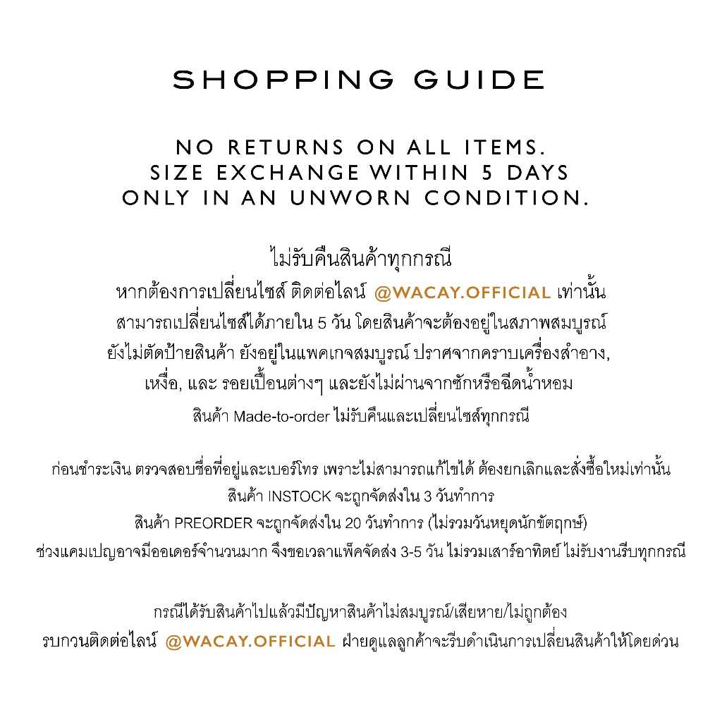 ● สินค้าสามารถเปลี่ยนไซส์ได้ภายใน 5 วันหลังได้รับสินค้า มีค่าดำเนินการและค่าจัดส่ง