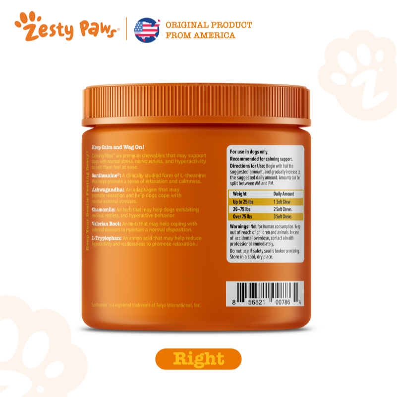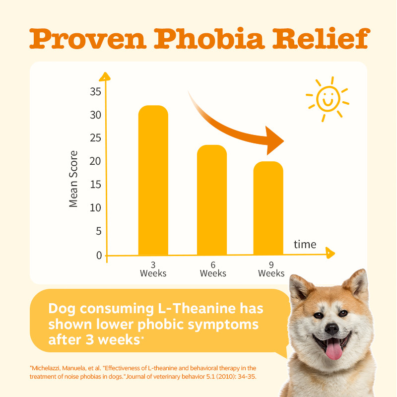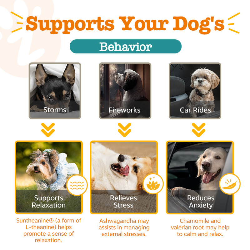 Soft chews with premium Sensoril® Ashwagandha and Suntheanine® to help support relaxation, calmness, and composure for dogs with normal stress.